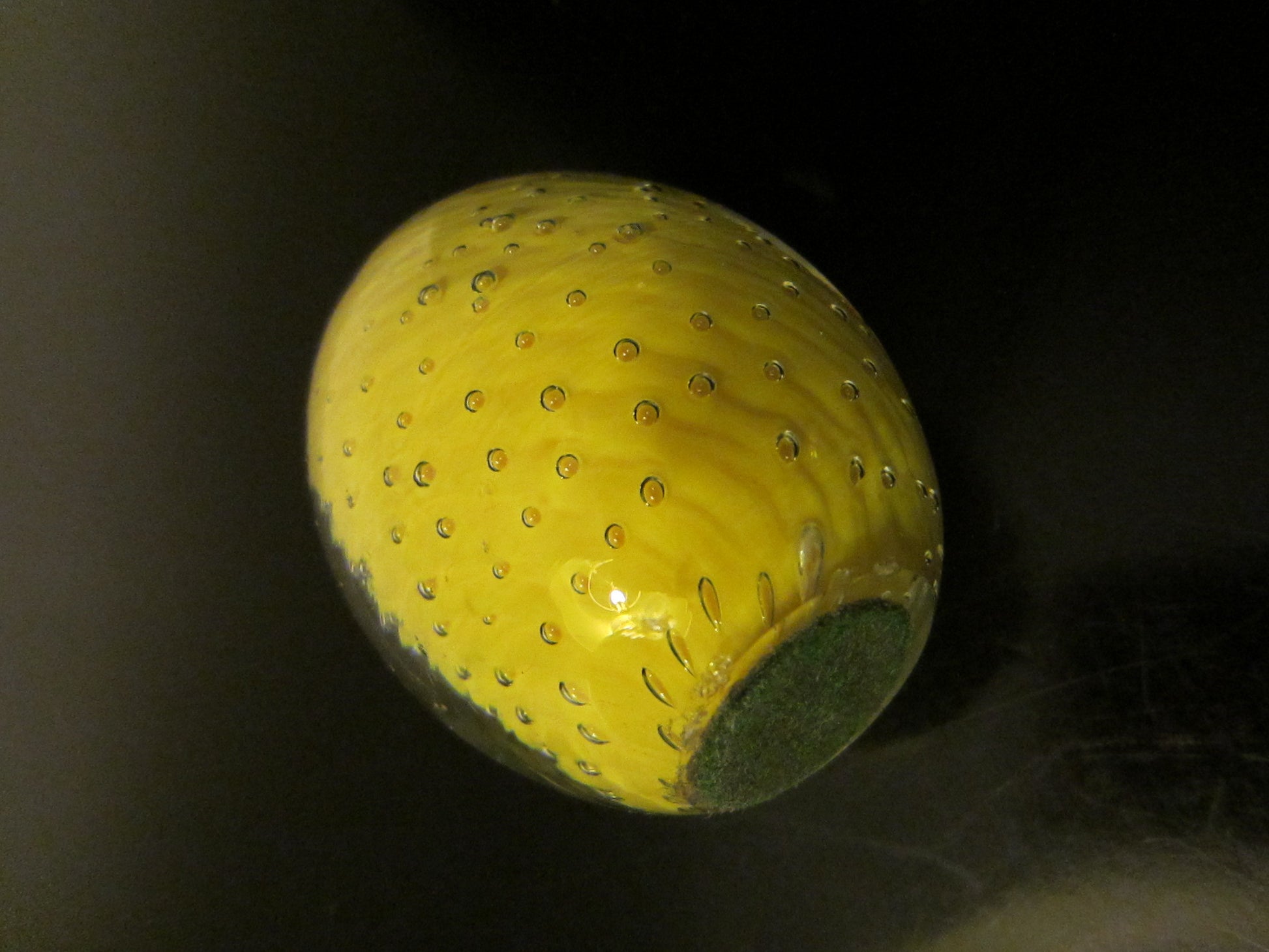 The color of yellow with bubbles are remarkable. we believe that is Murano glass egg from Italy , and we are calling it Golden Egg. the base is covered with green felt and is in excellent condition. It can become a good looking paperweight.