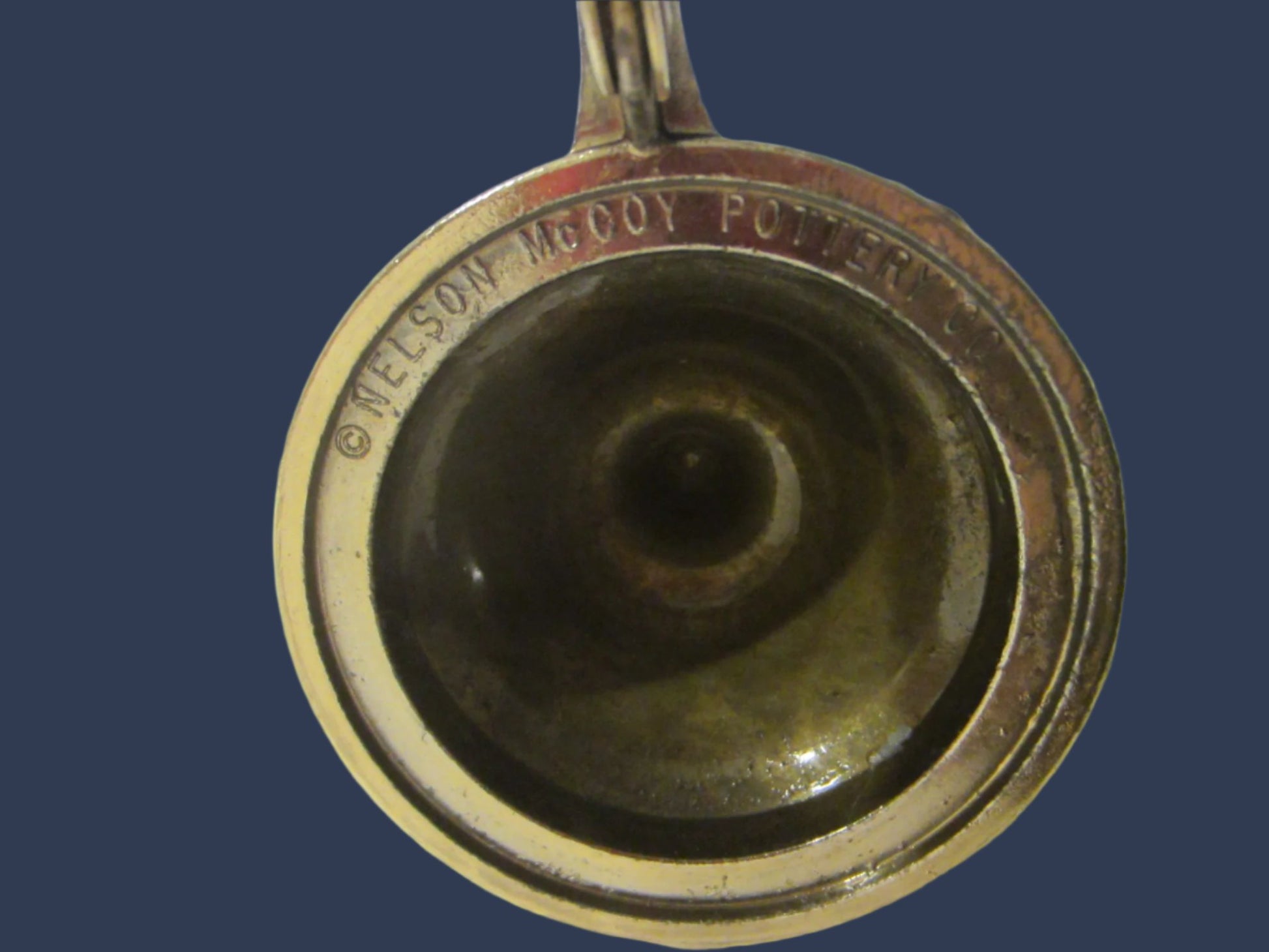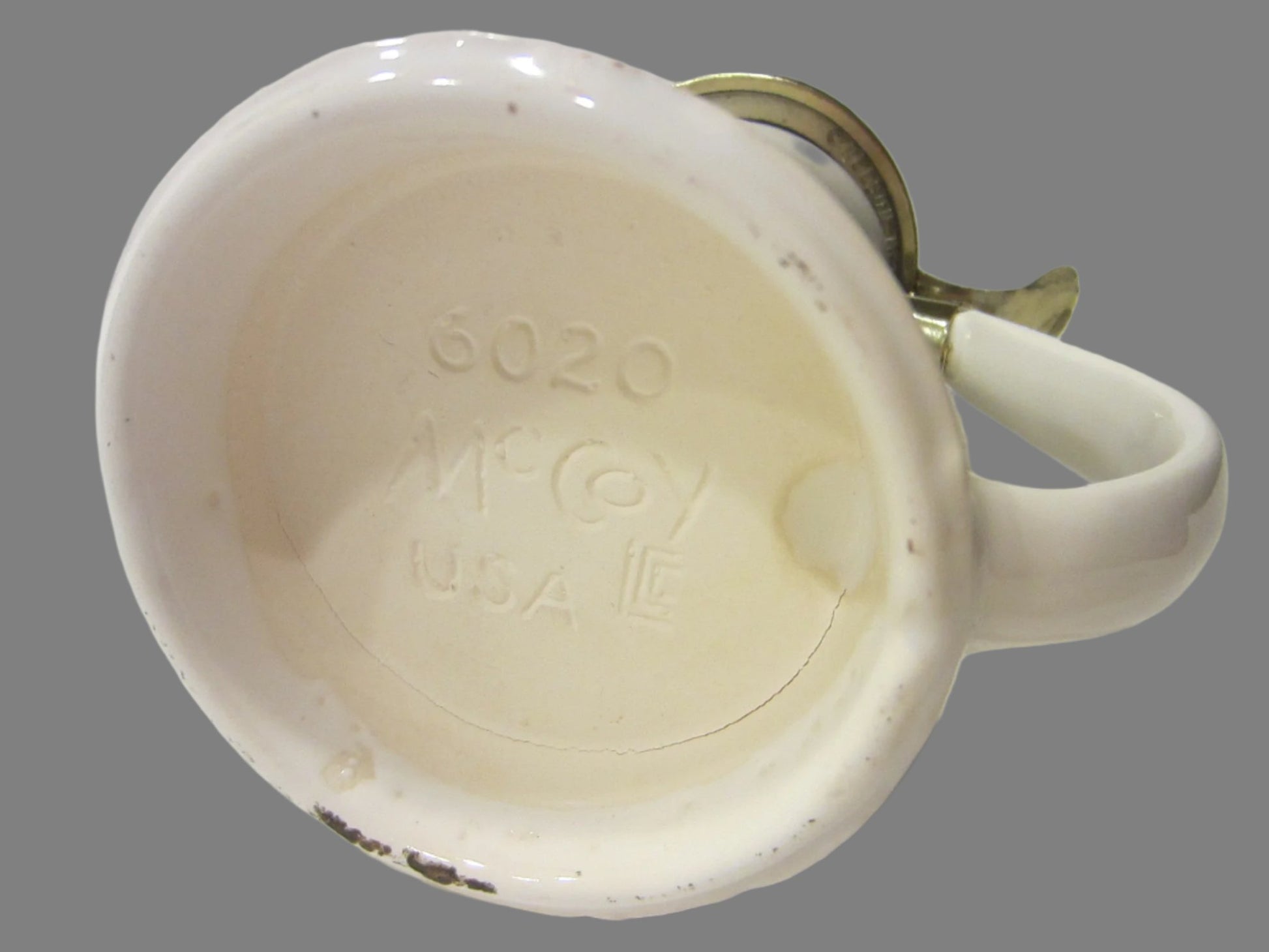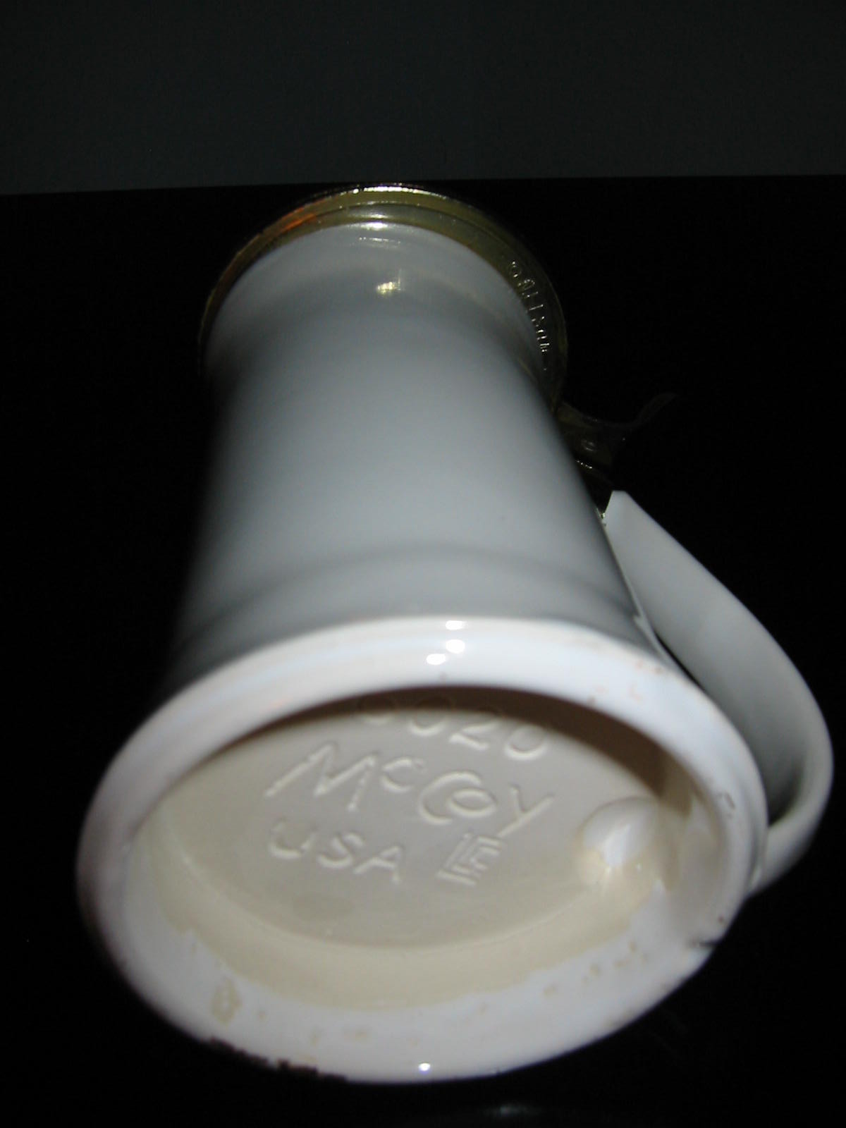 McCoy seascape remarkable ceramic tankard, with transfer very likely painted boats and blue ocean. It has incised mark, Nelson McCoy, 6020, with symbol. Decorated top with pewter lid,curvy handle. 9" h., 4" w. It has incised mark on the pewter noted ,C NELSON McCOY POTTERY CO. excellent condition.