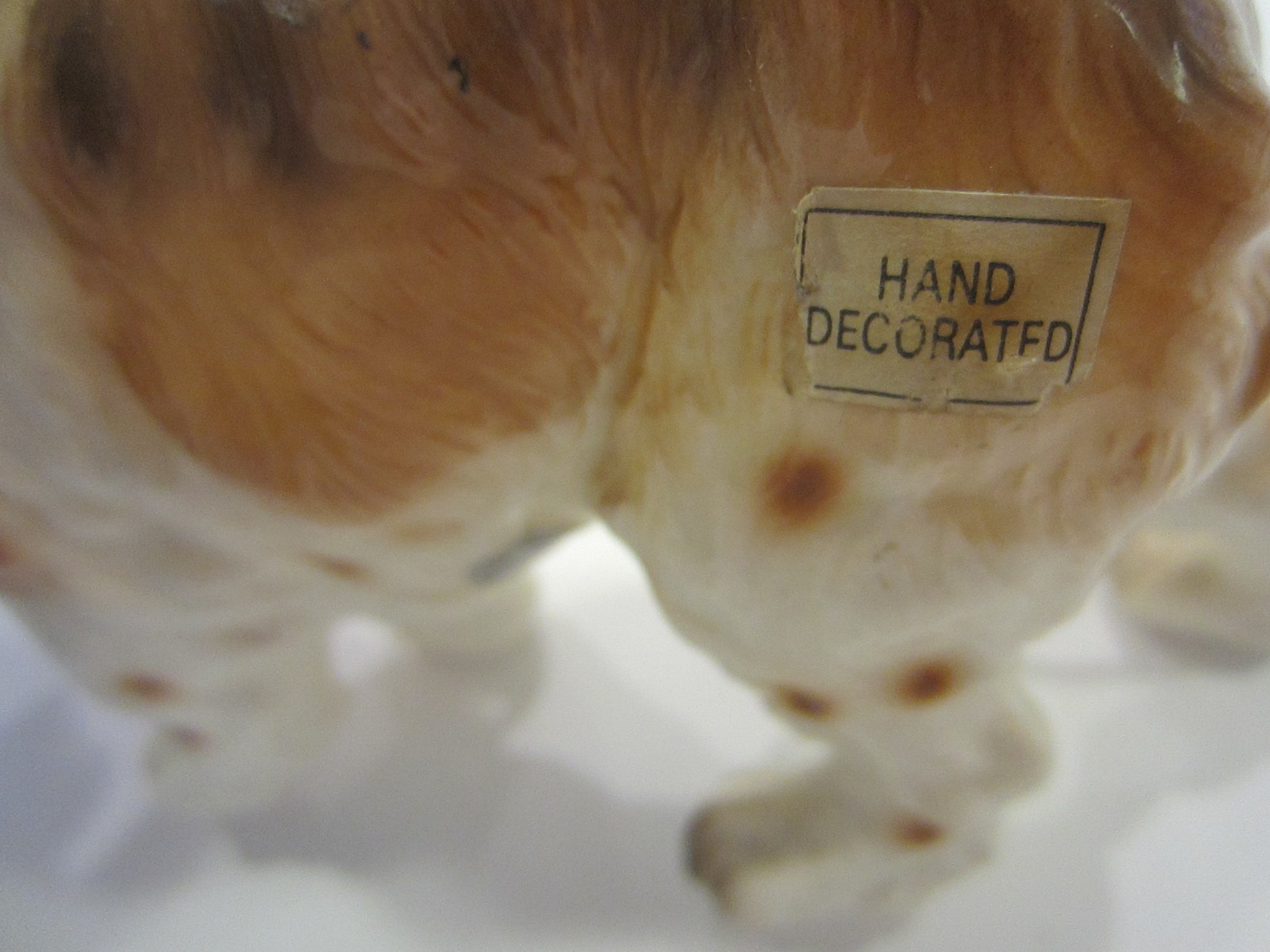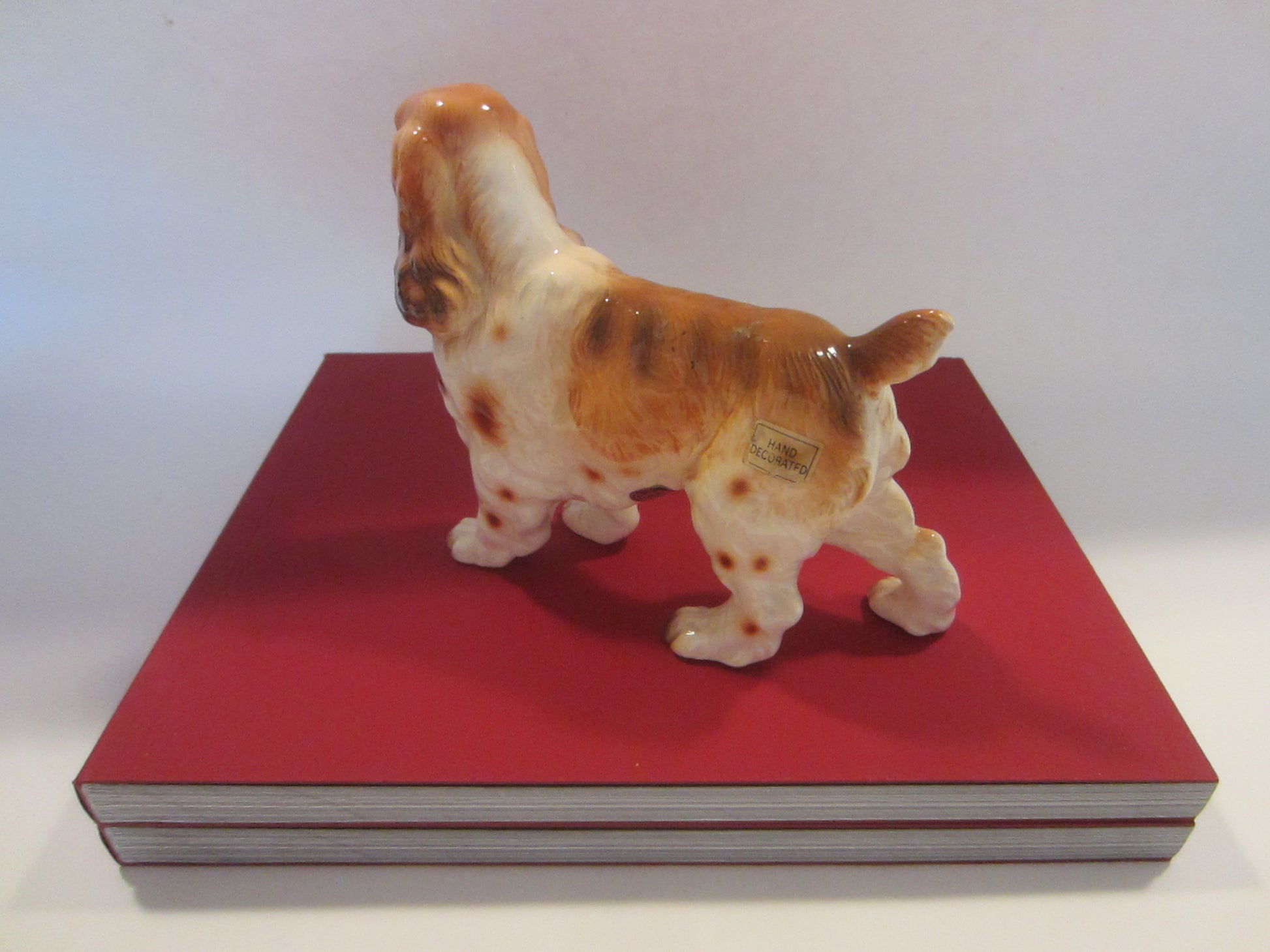 Norcrest dog ceramic porcelain figurine, beautifully Hand Decorated, Crafted in Japan, in excellent condition. Stamped and numbered, labels notes, Reg. US Pat. Off . dimensions are 5" x 7" x 2" .