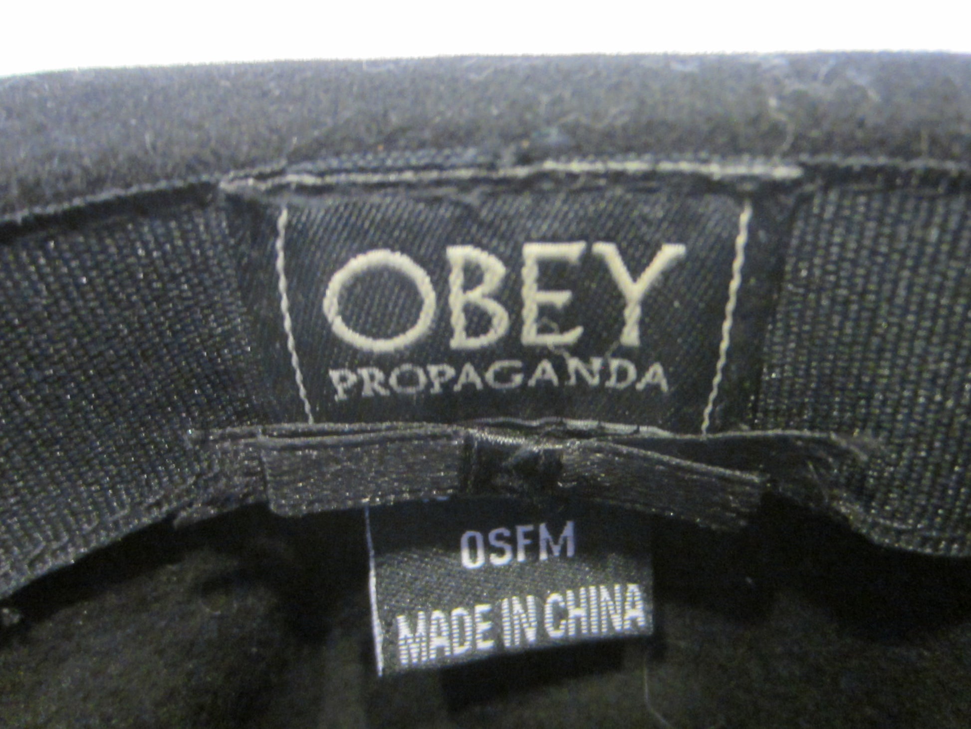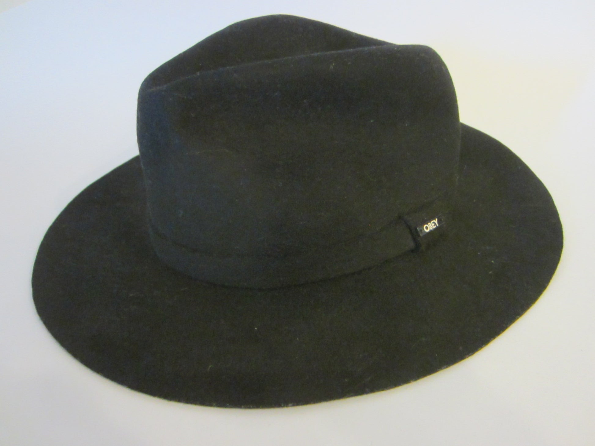 attractive, black fedora hat by Obey with metal tag mark. excellent condition, made of 100% wool and fits 8" head. Obey Propaganda made in China all noted on the label. softly loved, stylish to accessorize your wardrobe for day or night. 6" H. x 13" W.