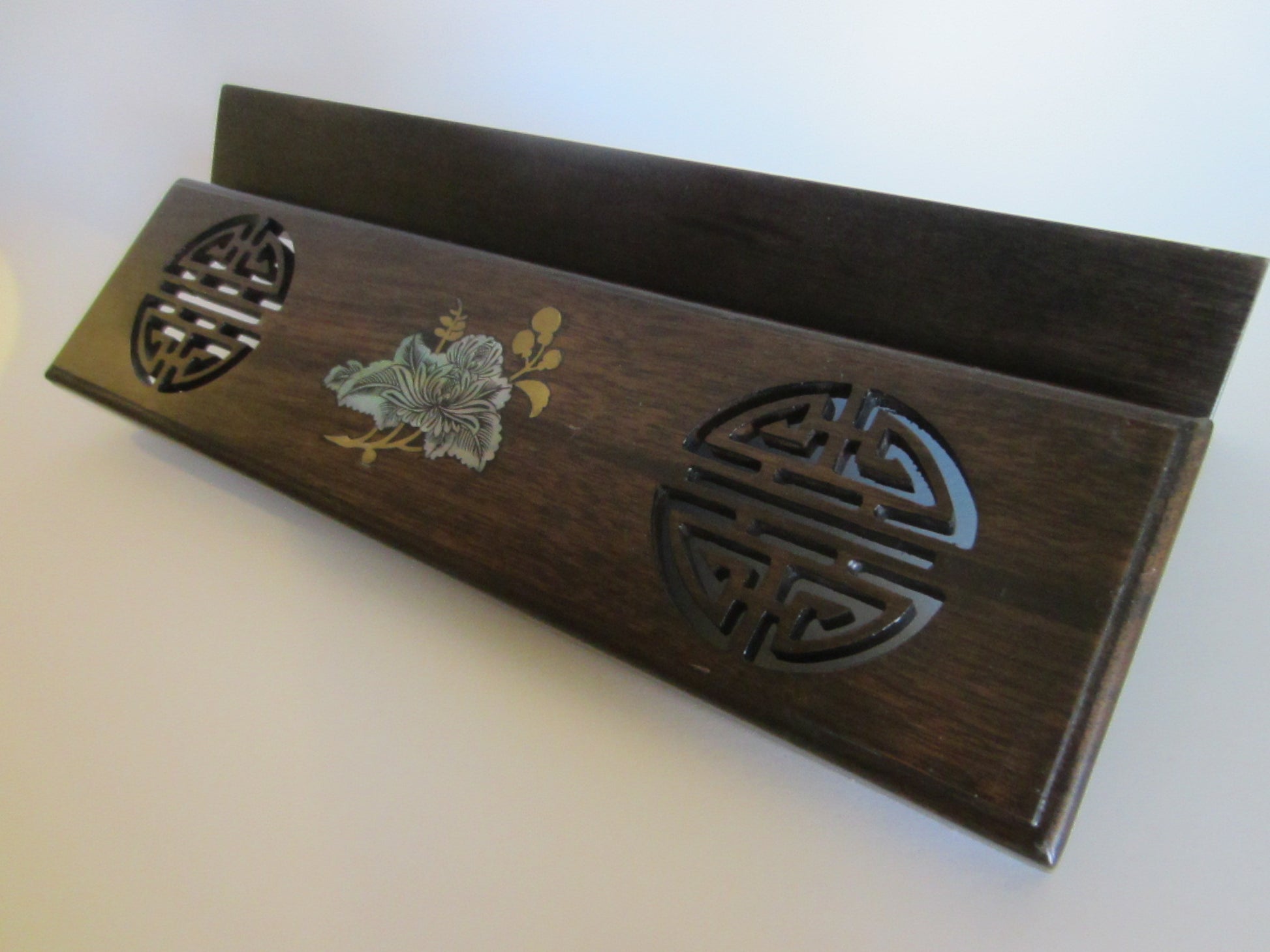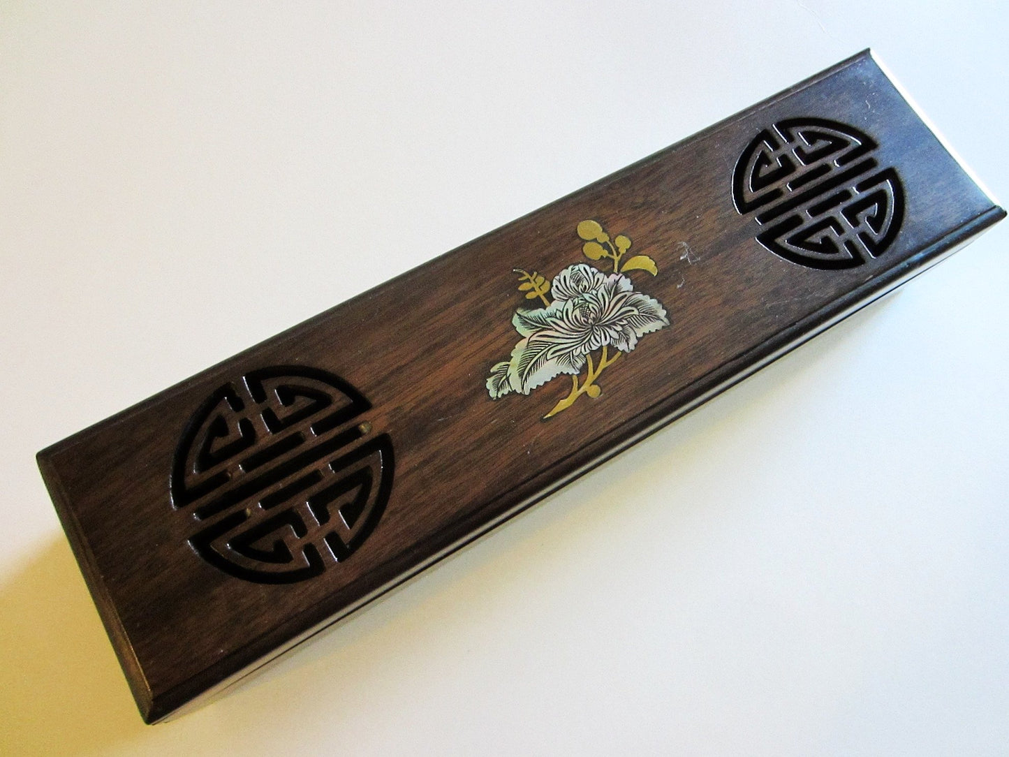 this attractive box is look like a wood, made of celluloid or pellucid. designed with beautiful Lotus mother of pearl flower, brass leaves. A symmetric emblems or symbols. in perfect pre-owned condition, and hinged. the rectangular box has unlimited design possibilities & personalities. measuring 2" in heights from the surface, about 11" wide, and about 3" L.