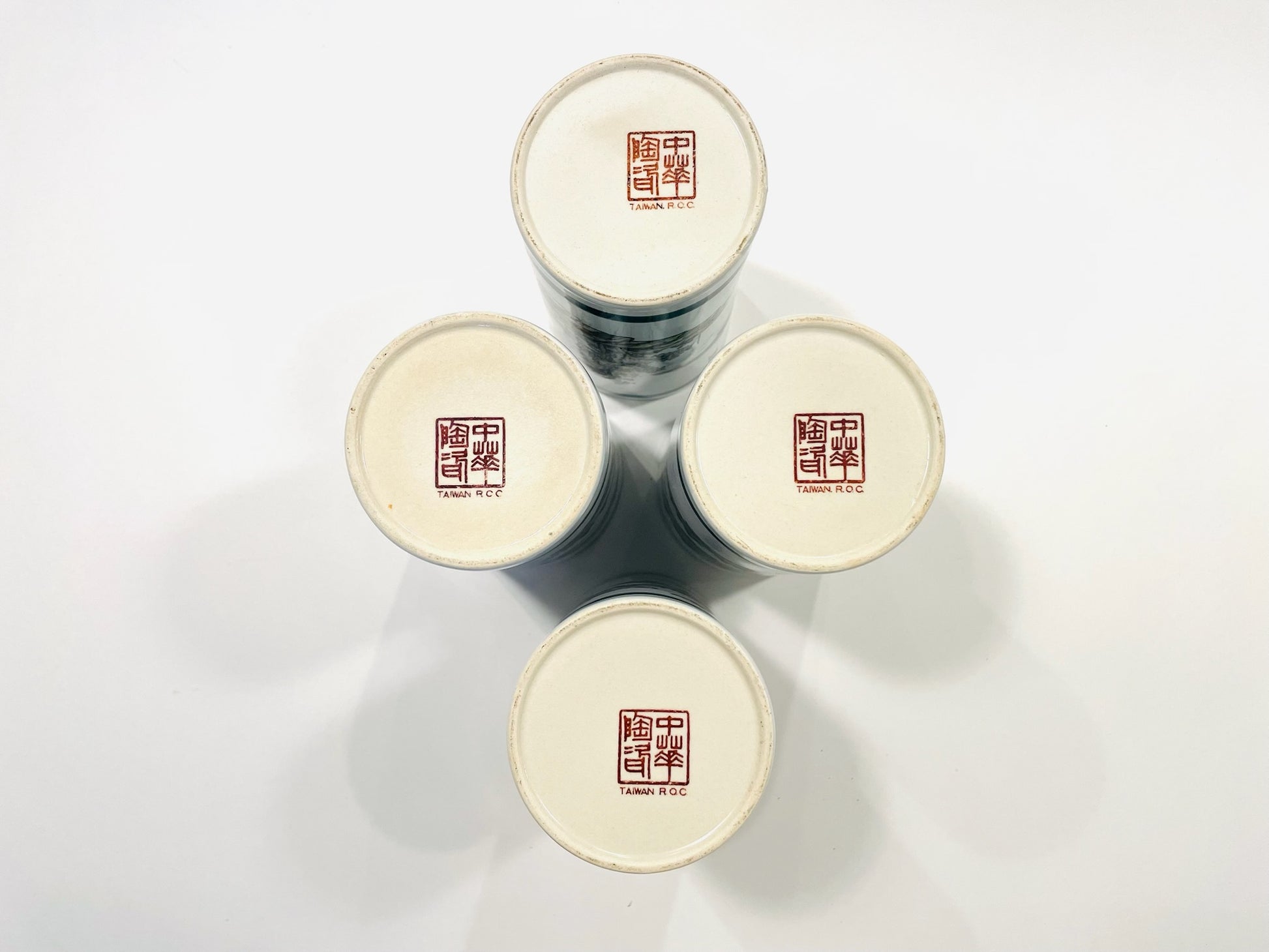 All Marked, stamped Point Blanc calligraphies are on the objects under the green borders. translated by Google. A set of 5 glazed celadon porcelain vases or tumblers of Taiwan Roc. Excellent condition, colorful on whites, inspiring outdoor scenery mountains, greenery, cottage, blossom red flowers, borwn stones, fisherman fishing, and green trees. They are decorative. Very likely made around 1970's when Taiwan was officially recognized as the republic of China on the export marks. Celadon is a type of ceramic with a soft grey green glaze. Each is 6" H. x 3" diam. Round shape.