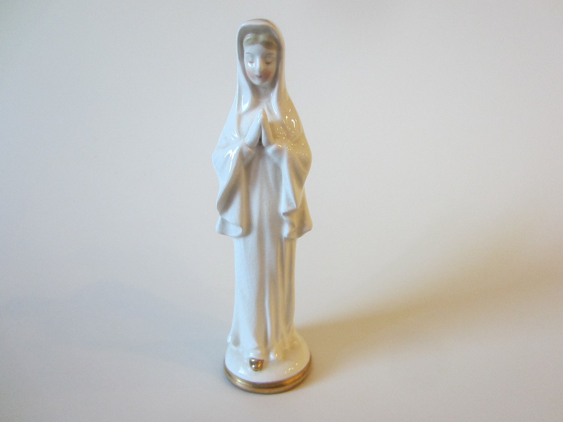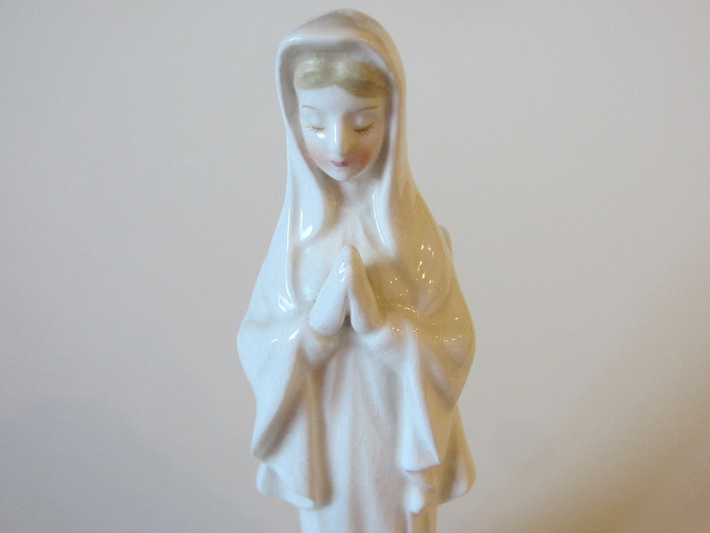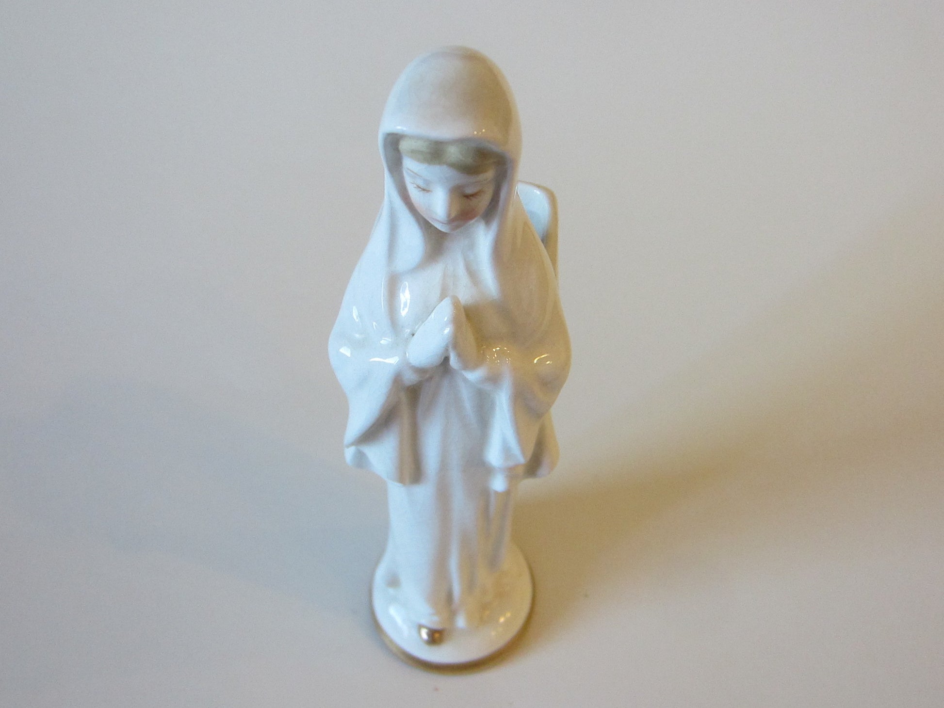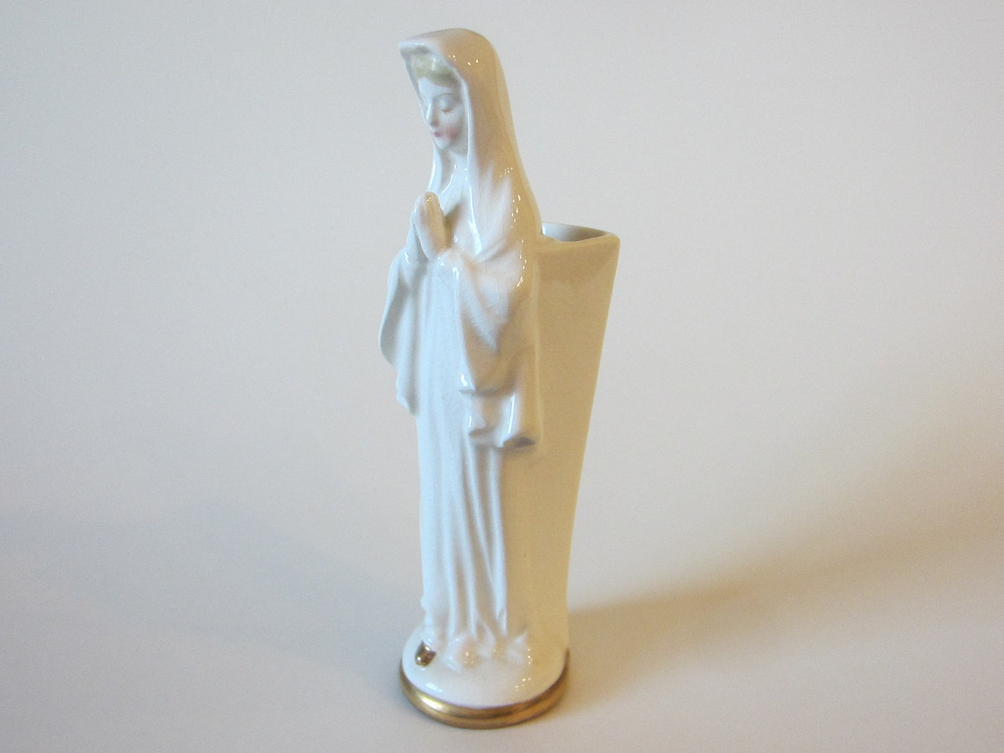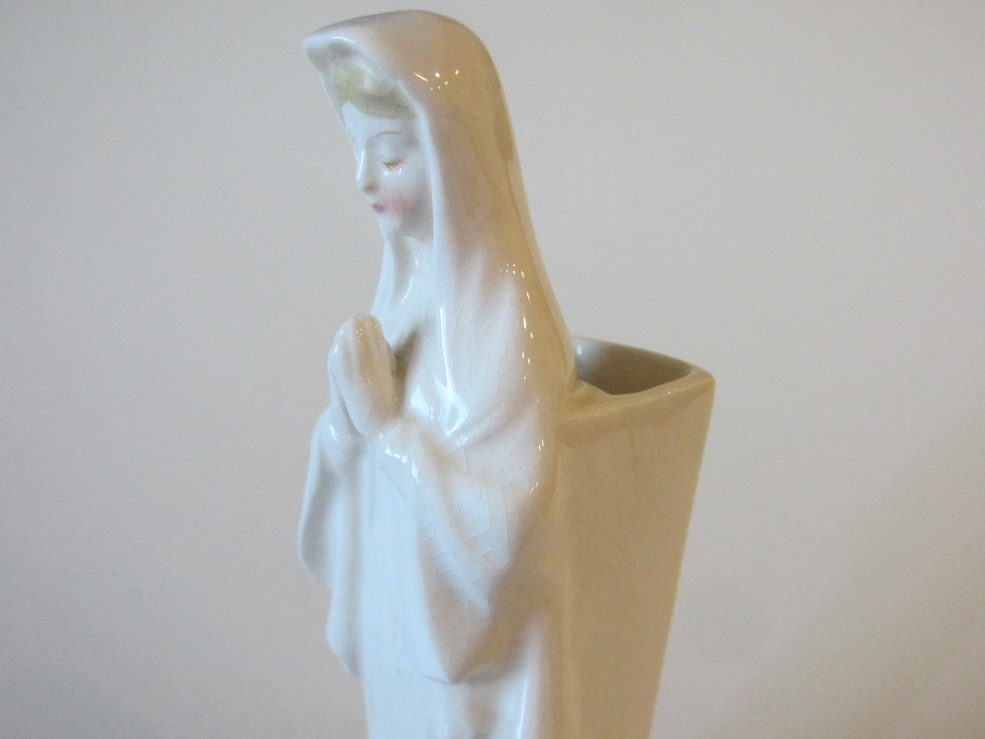 a beautiful folk art figure of praying Madonna, a white porcelain with crazing, in vintage era. it has a box verso for carrying rose bud, as a planter, or enough space to fit few narrow objects for decor. aged, without imperfection. the crackling as a result of age wear, or within. masterfully painted in gilt over shoe and edge. gorgeous holly face, with shines, blonde hair, rosy cheek. 7" H. x 2" Base D. opening verso measures 1.5" x 1".
