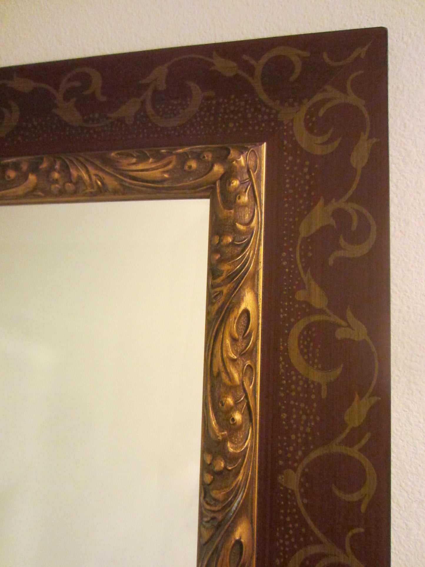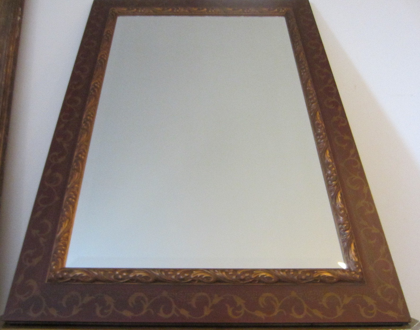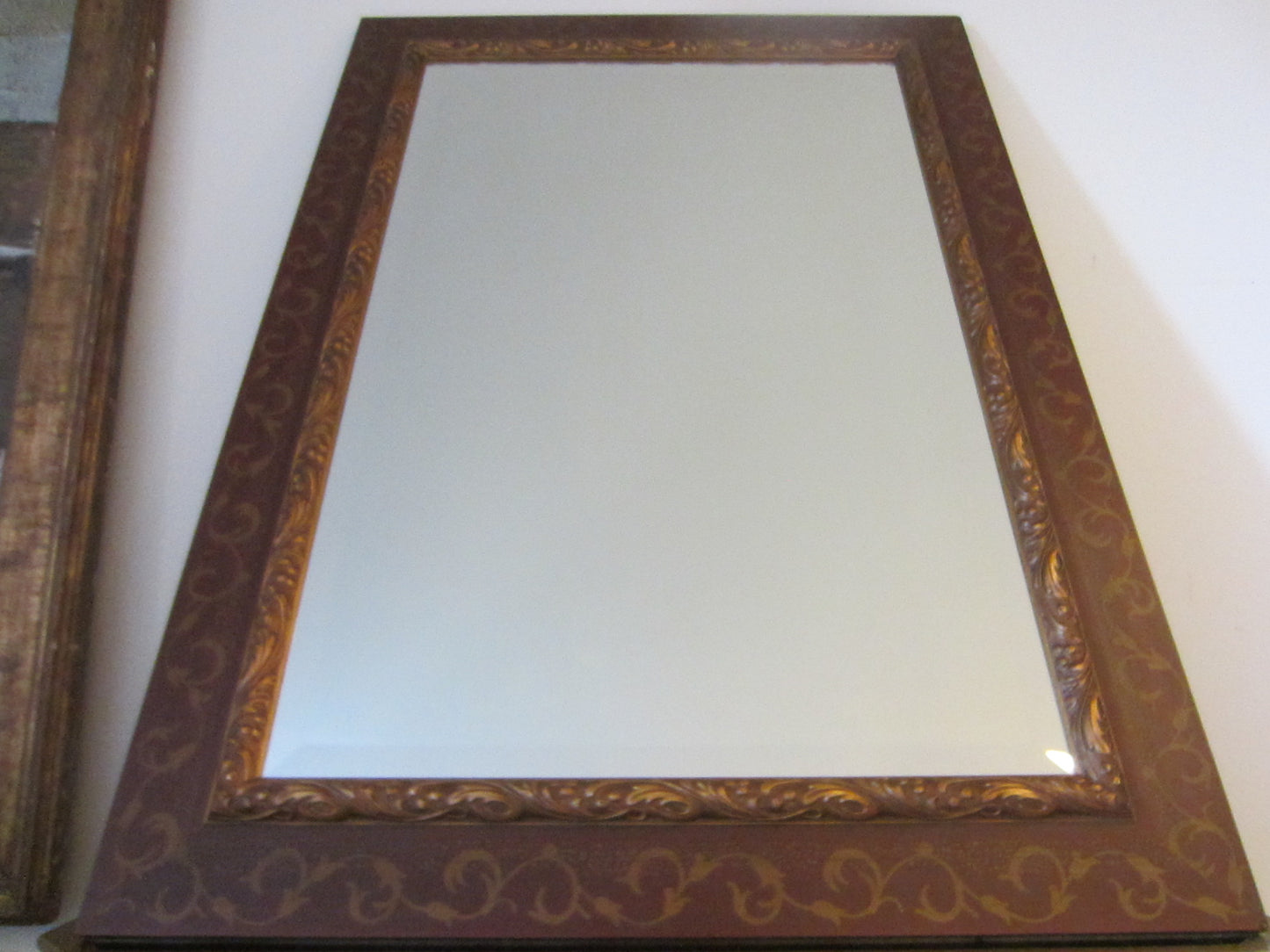 Beautiful rectangle shaped beveled wood mirror, gilt decorated stencil relief. In excellent condition, heavy vertical/horizontal design for floor or wall. Ideal for Entry Foyer, Living, Dining Rooms, also Bathroom or Bedrooms. Secured verso, paper covered. Extremely Heavy