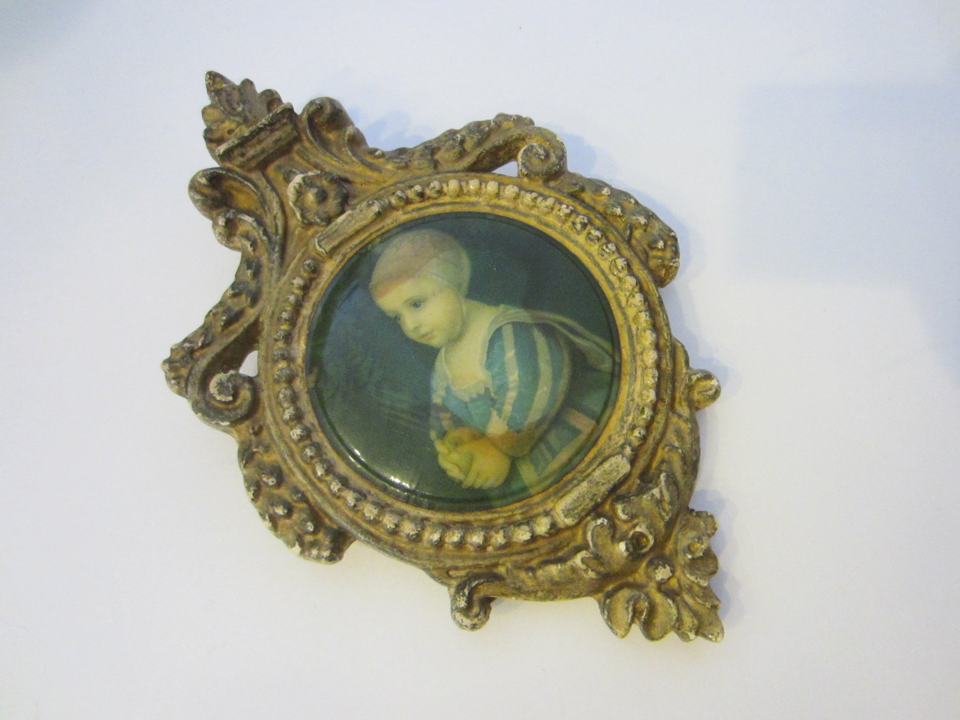 Decorative, historic and cute, antique child portrait icon, is in rococo style, comosed gilt decorated frame. Child is holding apple.Hanging metal ring verso. The green blue contrast is beautiful the wall or the stand. Floral decoration, crest top. Aged, excellent, expect variation for being around for decades.