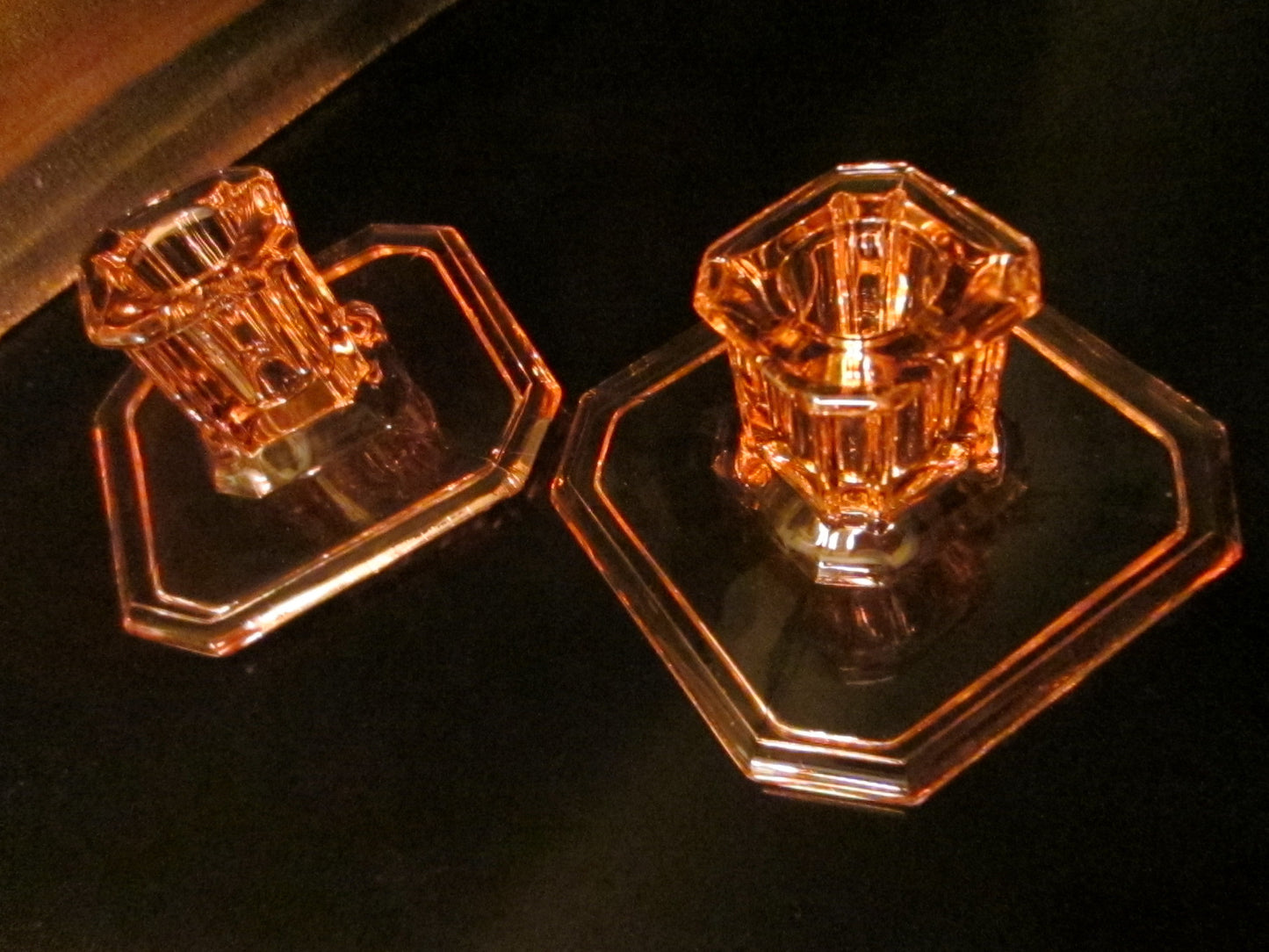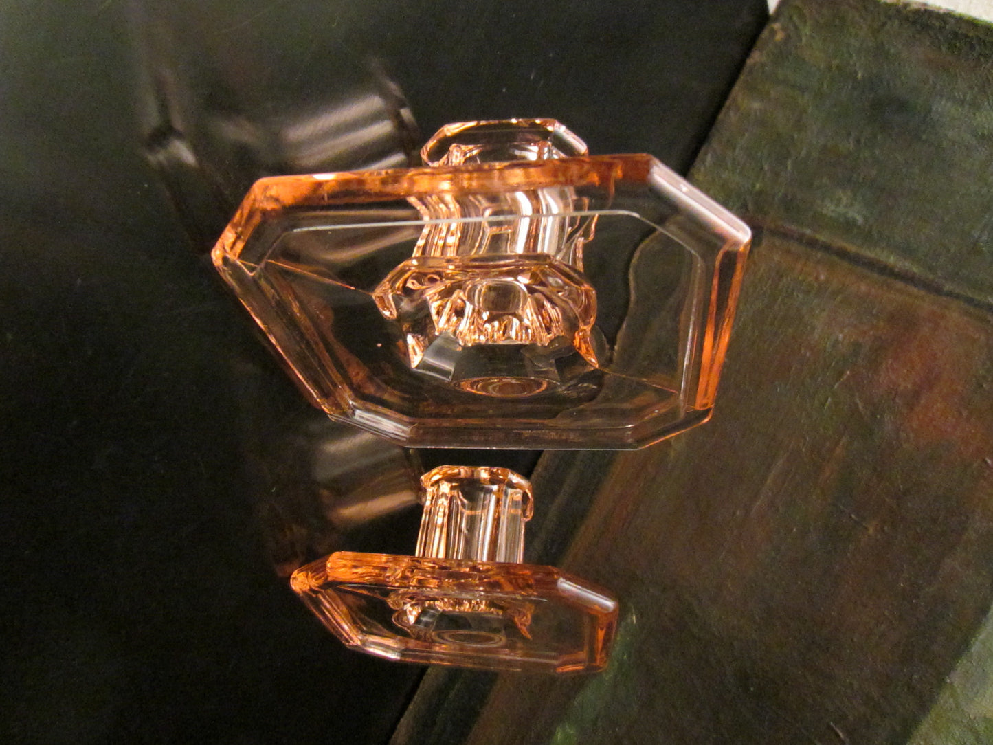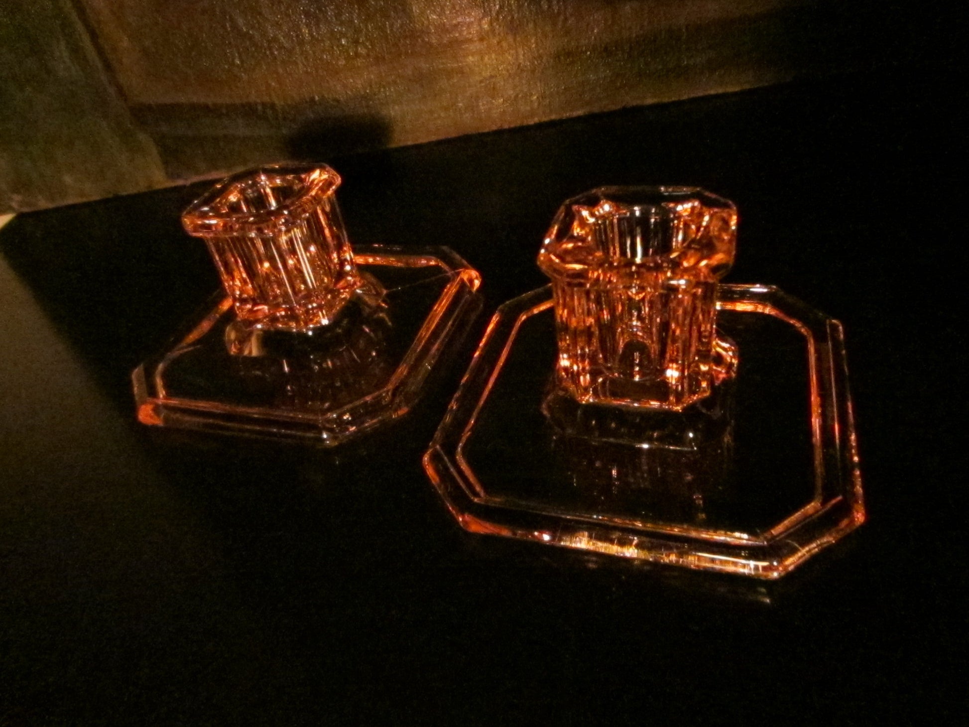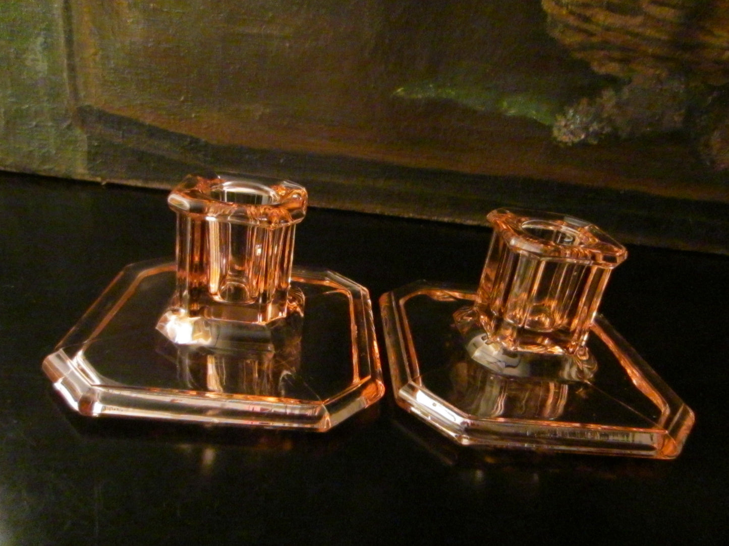 antique Tiffin rosy pink glass pair of candle stands/candle holders, with excellent condition, 2.5" h. 4" w. fits one inch candle and are fabulous !