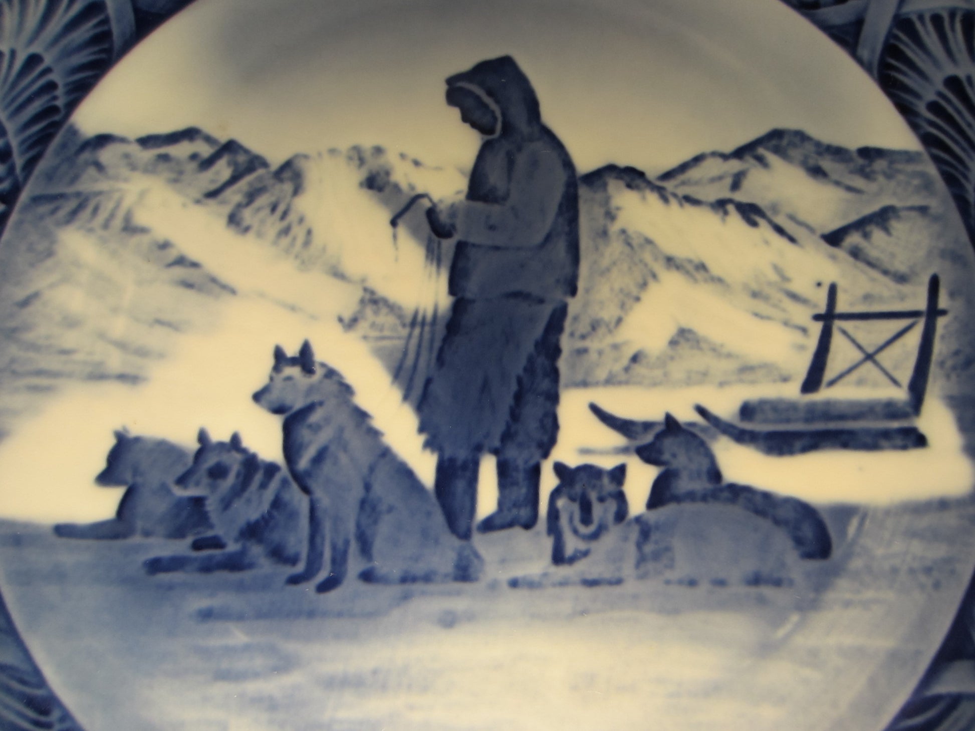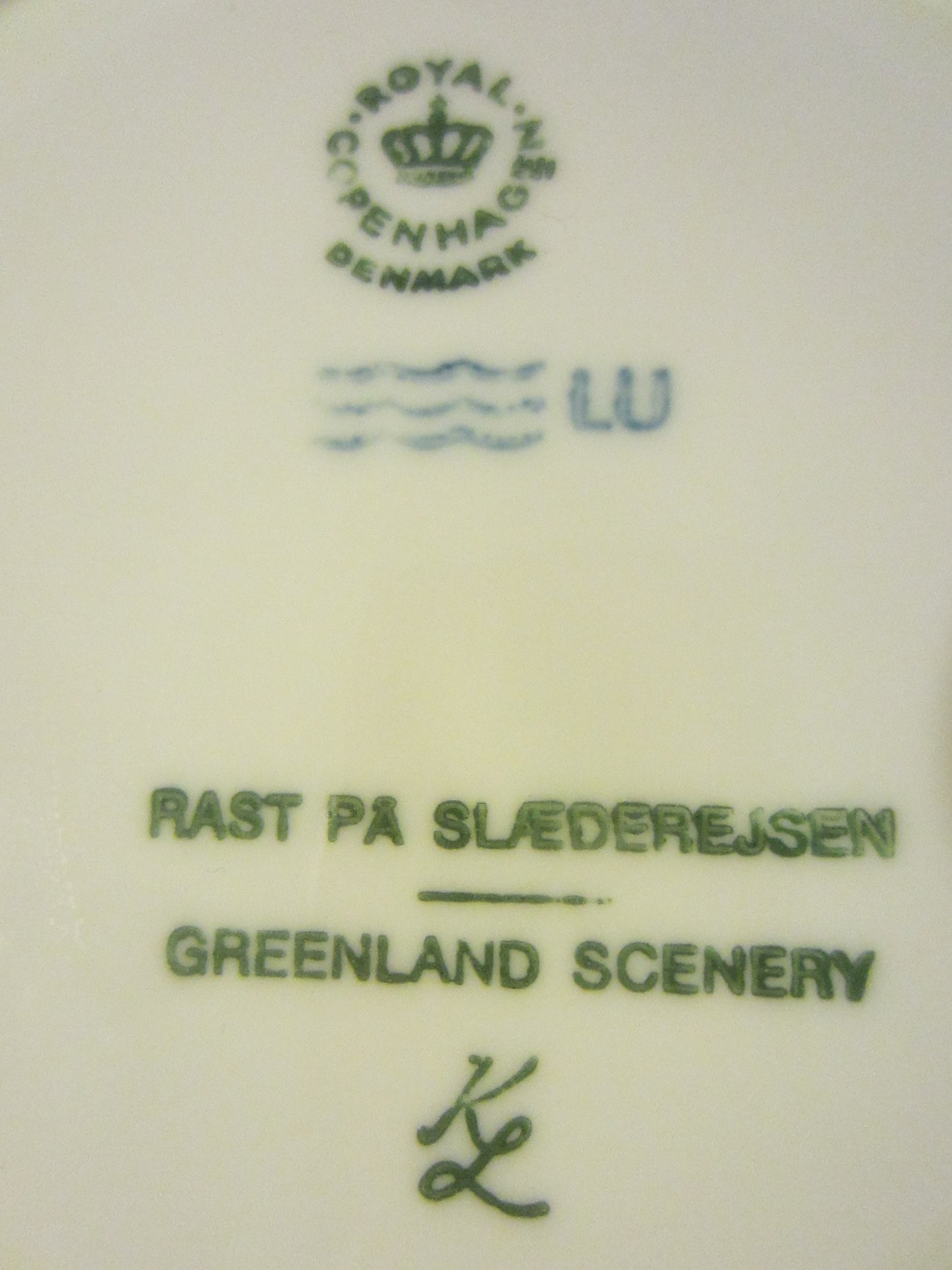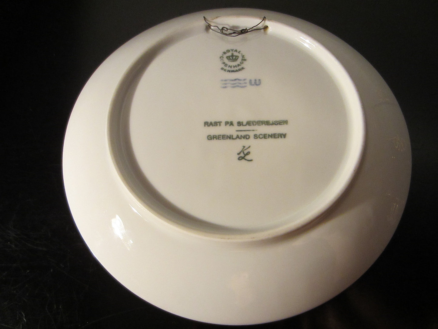 inspiring a vintage porcelain plate, crafted in majolica style by Royal Copenhagen Denmark Lu . It has porcelain stamp mark, dated 1978, with symbols. in excellent condition. designed with wire , for wall hanging, or beautiful on the stand.. depicts Mountain, view, majestic blue white figure of wild animals "Wolves" , white star above the top on the border. quite decorative, made in Denmark by Royal Copenhagen, Greenland Scenery. 7" diam.