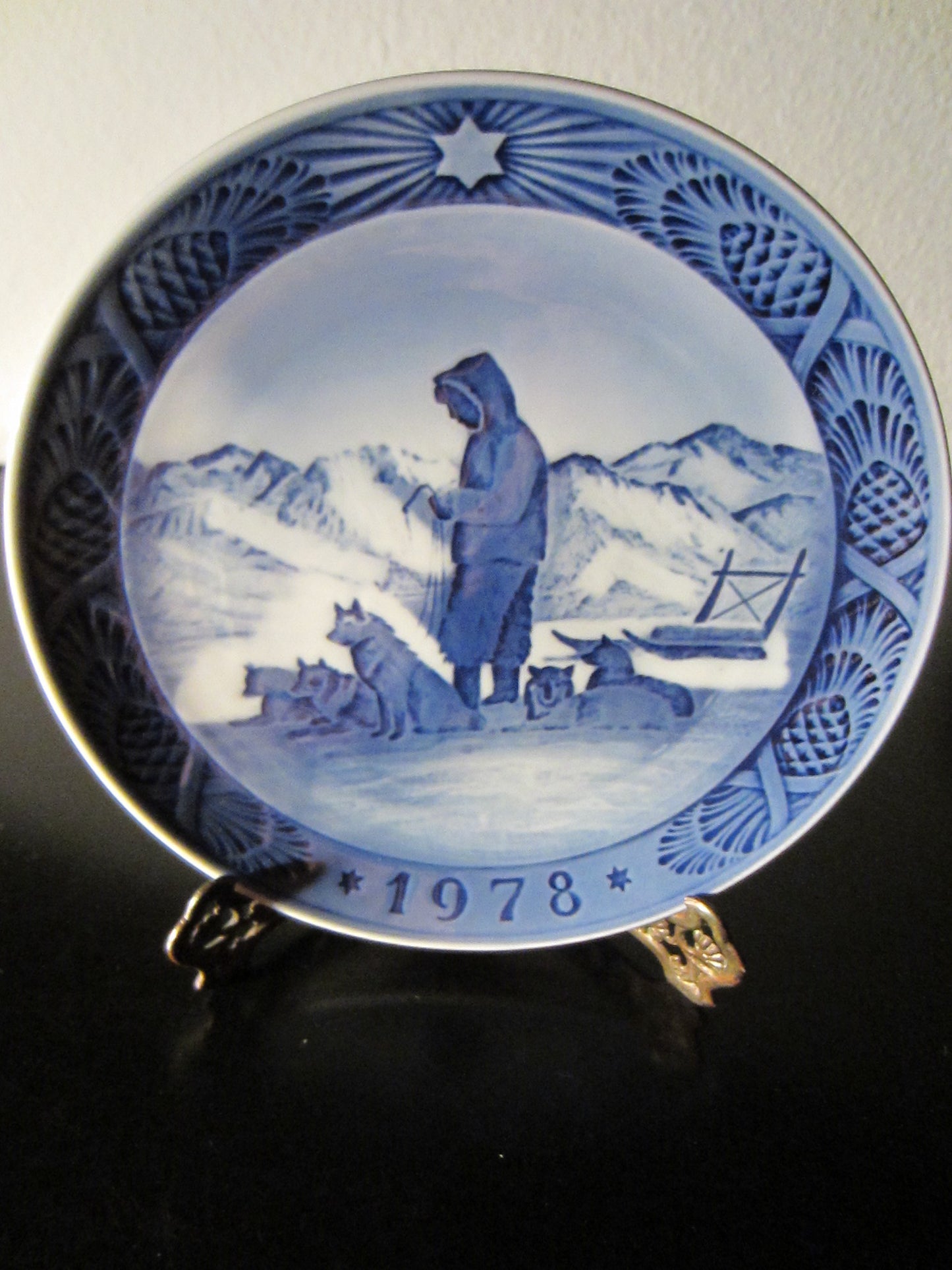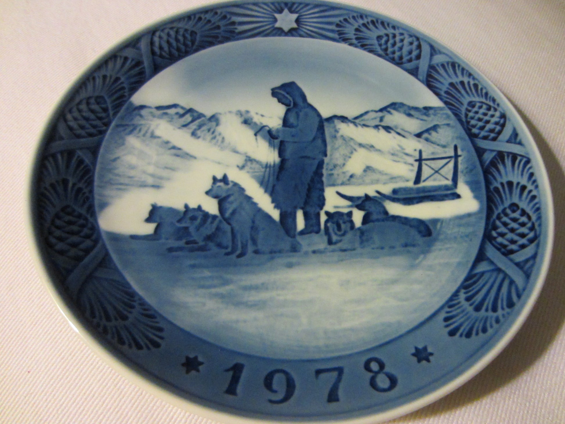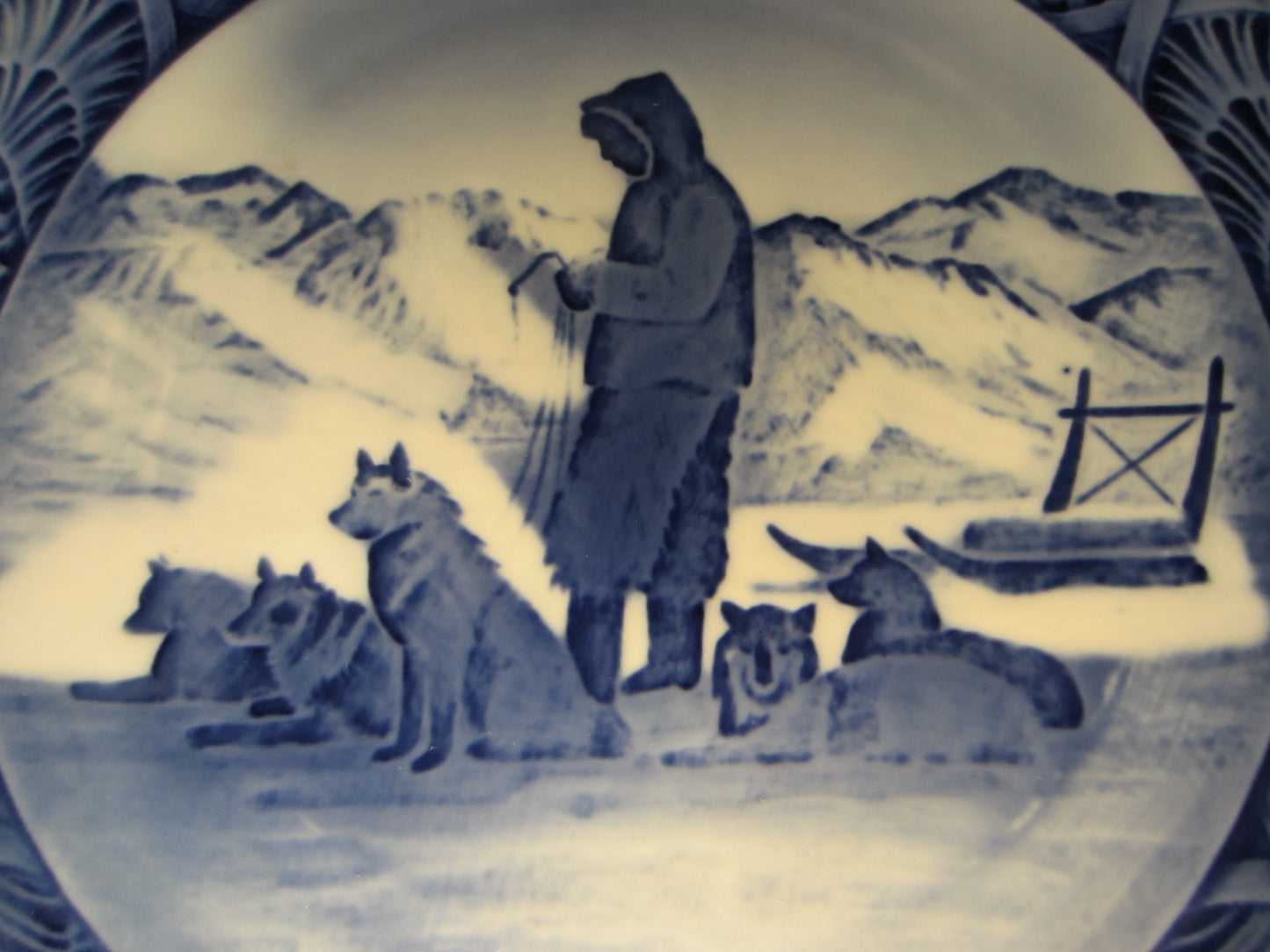 inspiring a vintage porcelain plate, crafted in majolica style by Royal Copenhagen Denmark Lu . It has porcelain stamp mark, dated 1978, with symbols. in excellent condition. designed with wire , for wall hanging, or beautiful on the stand.. depicts Mountain, view, majestic blue white figure of wild animals "Wolves" , white star above the top on the border. quite decorative, made in Denmark by Royal Copenhagen, Greenland Scenery. 7" diam.