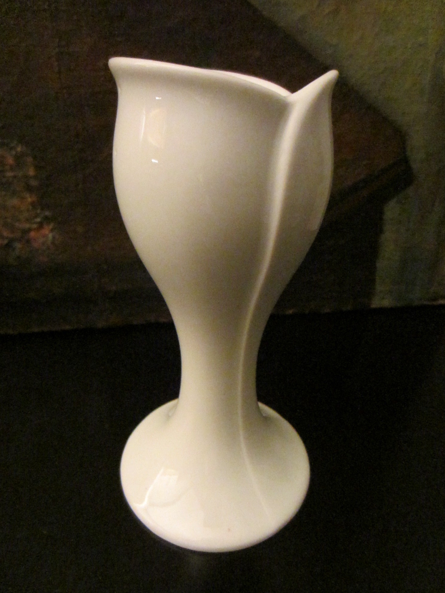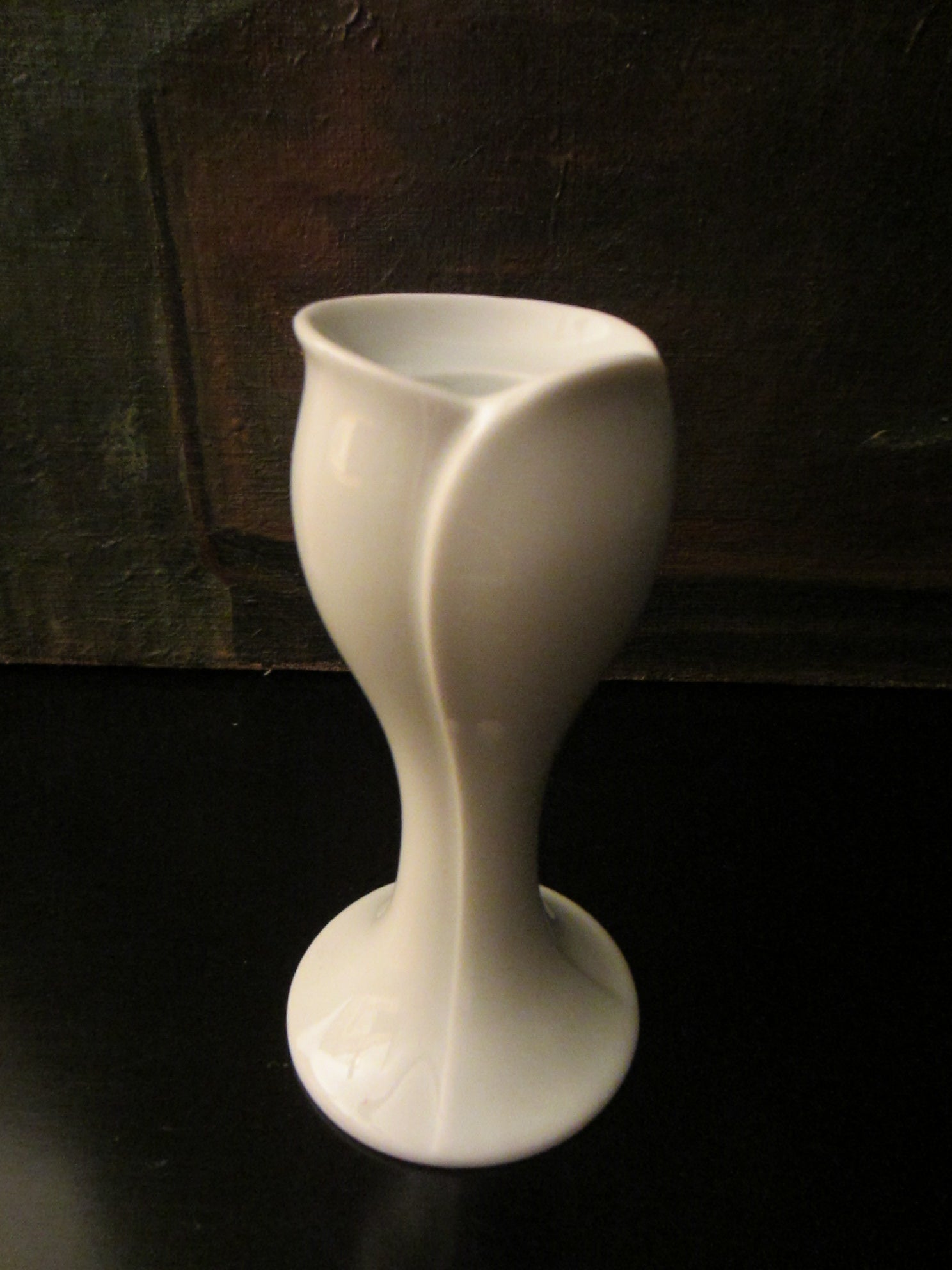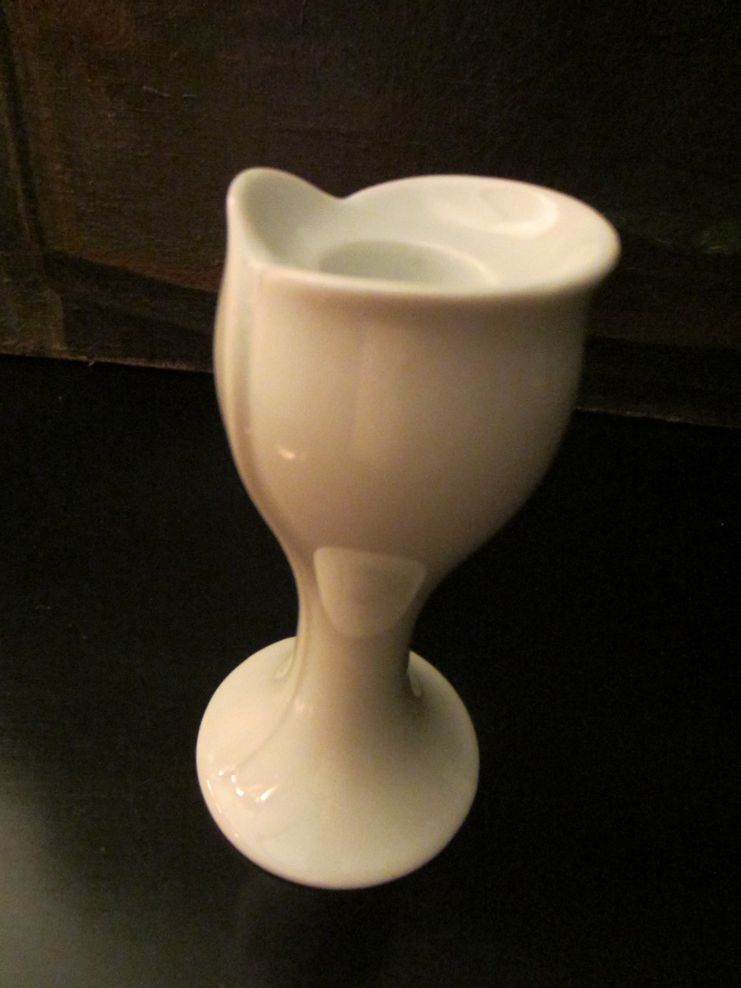 Royal Porzellain Bavaria KPM white candlestick, tulip design, excellent condition. Stamp Marked Royal Porzellain Bavaria KPM Germany Handerbeit , Made in W. Germany. 5"h. x 2" w. x 3" base d. Fits 1" candle. From after World War II.