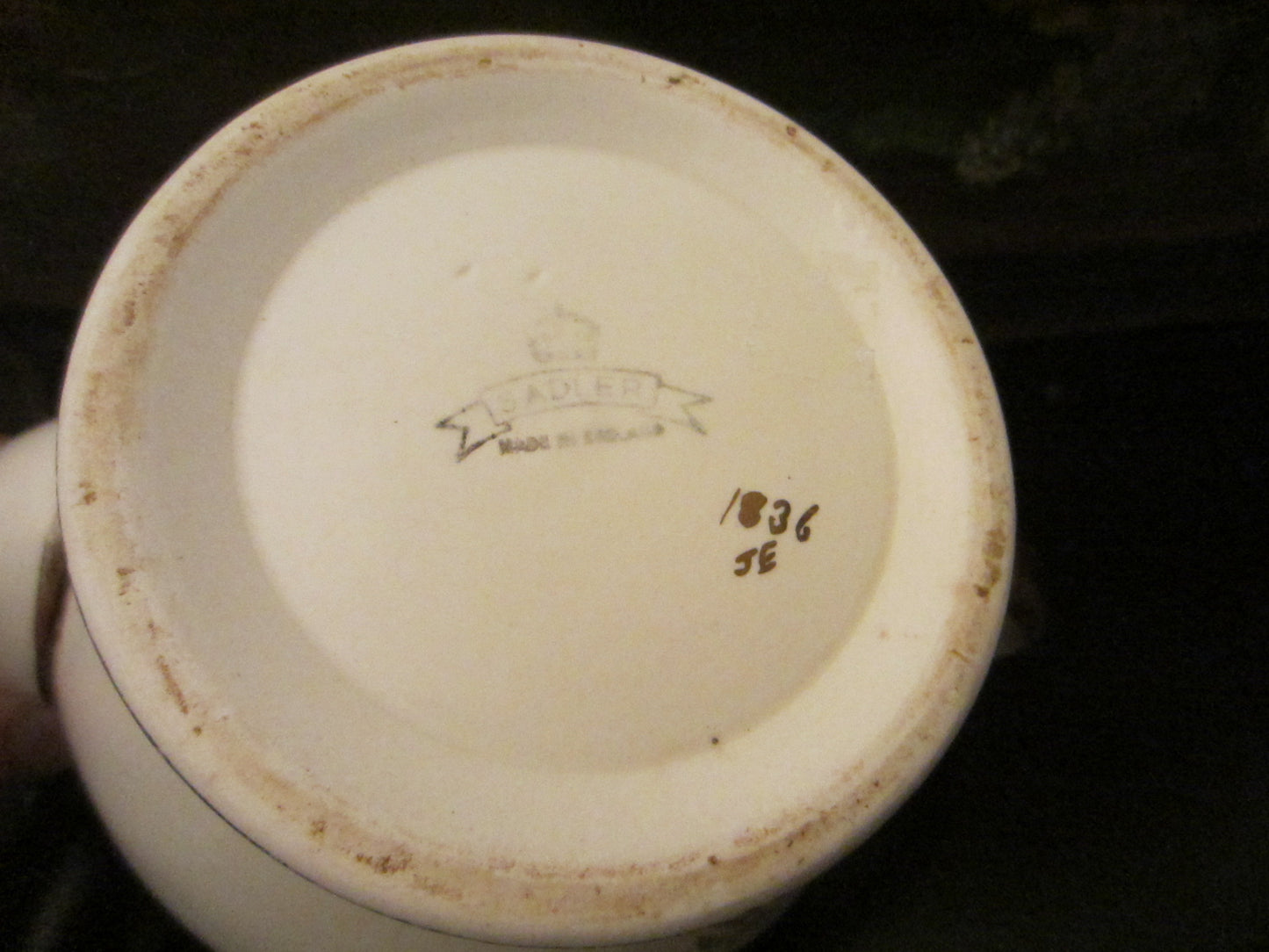 A known name Sadler, and this gorgeous vintage bisque teapot. Made in England, with decorated pink flowers , skillfully hand painted, in gilt accent. It has mark of Sadler, symbol, and numbered and in gold, 1836 . JE Maker's monogram, crown and banner symbol. Aged, in excellent condition. Measuring 8" H. x 9" W.