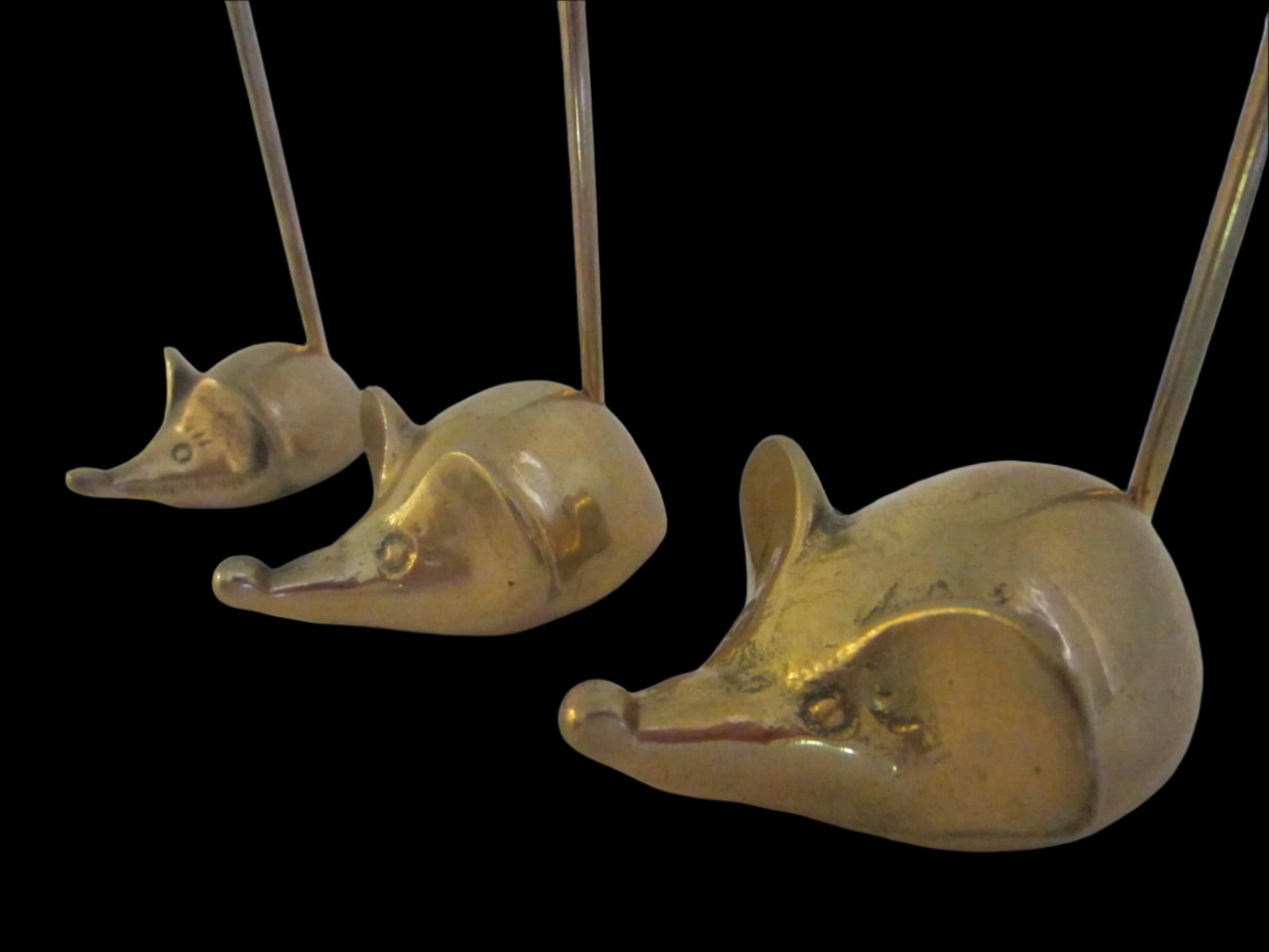 They make decorative desk accessories. they are good to hold rings, on vanity. three solid mid century modern brass mice, in group of three. made in Taiwan with sticker marks. excellent aged, three sizes. 4.5" H. x 3" W. x 2.5" & 2" width.
