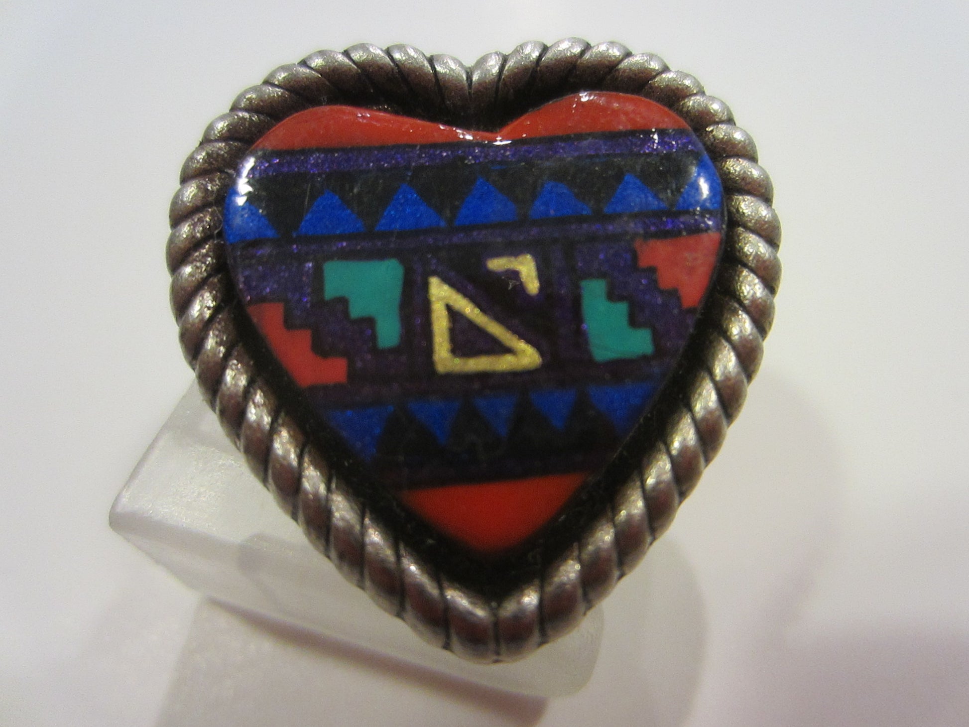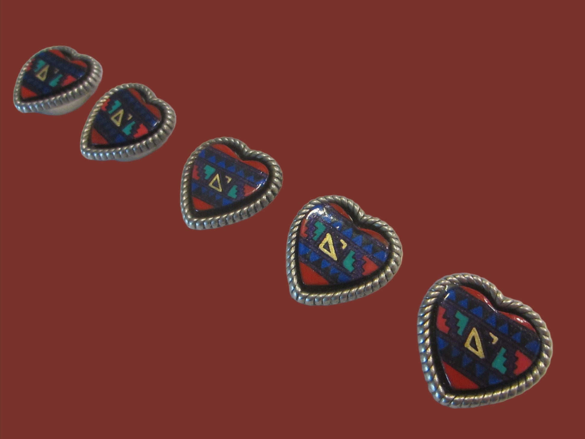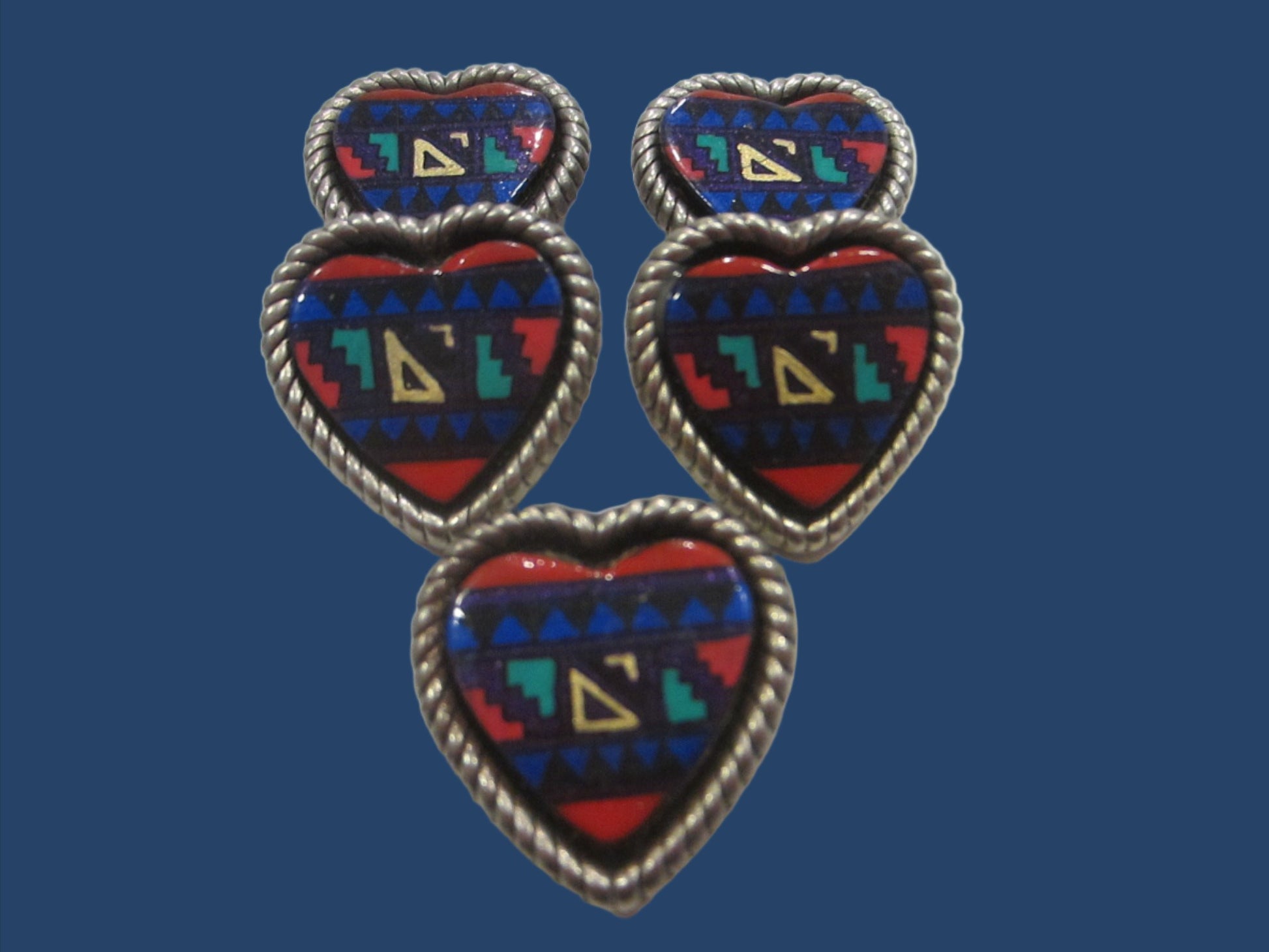 it's colorful, heart shape, with functionality, to embellish a quilt, to design head boards, a coat or dress or use it as a cuff links. they are set of five, over white metals. hand crafted, in blue, red, yellow, in shape of Heart. excellent condition, and measures 1 inch each. (photo's may shown blemishes).