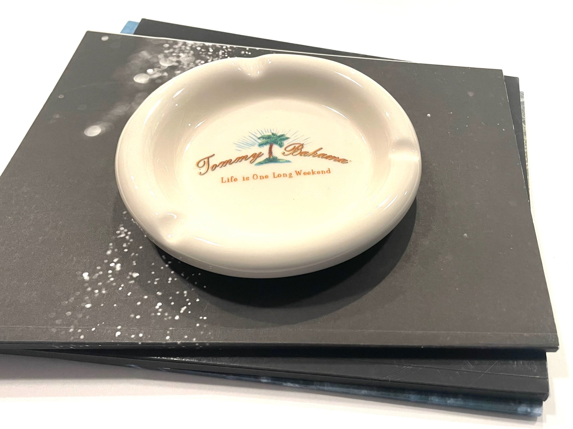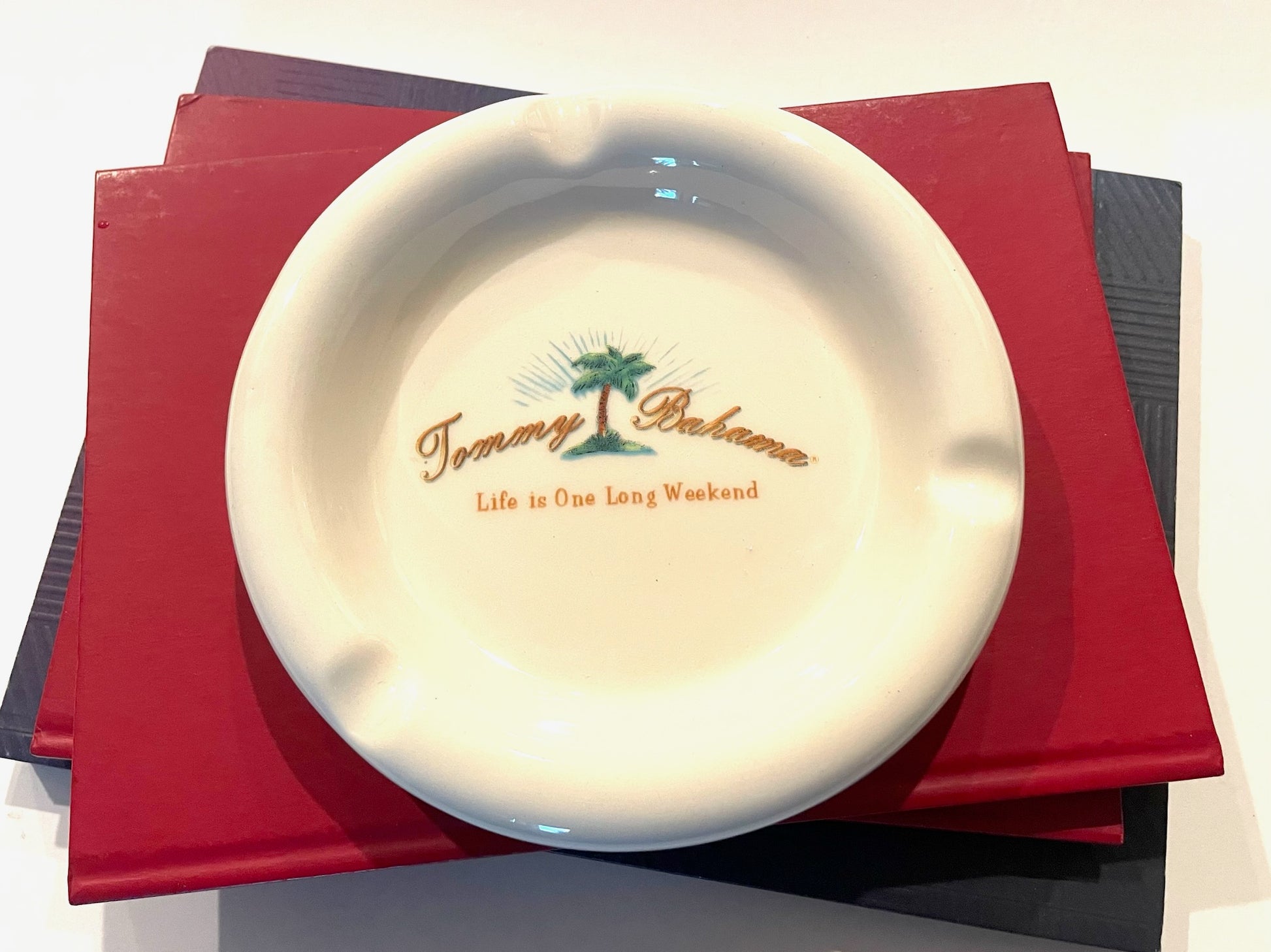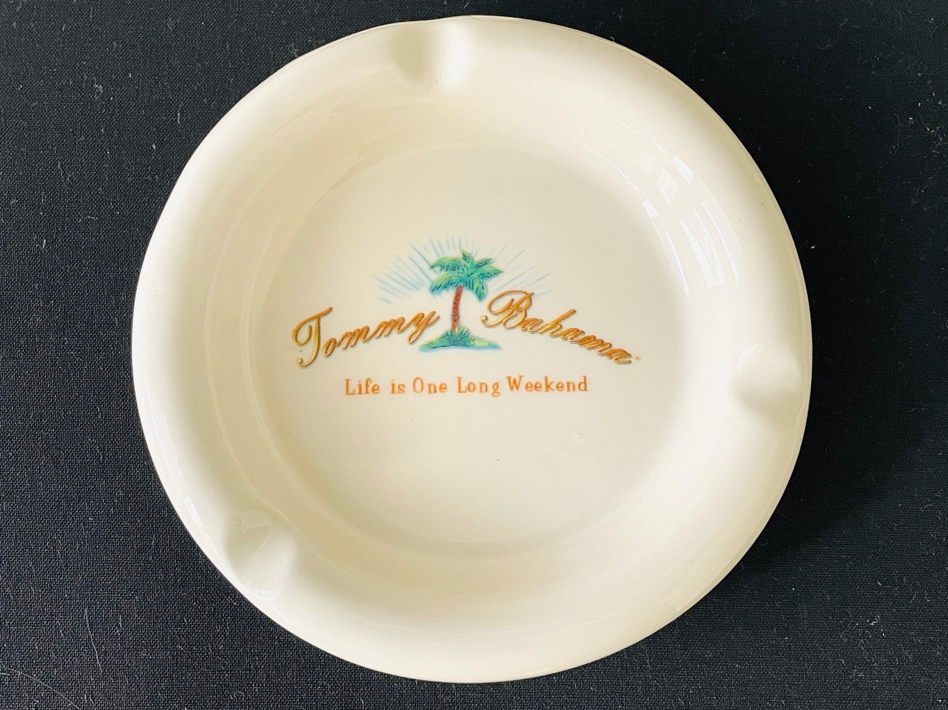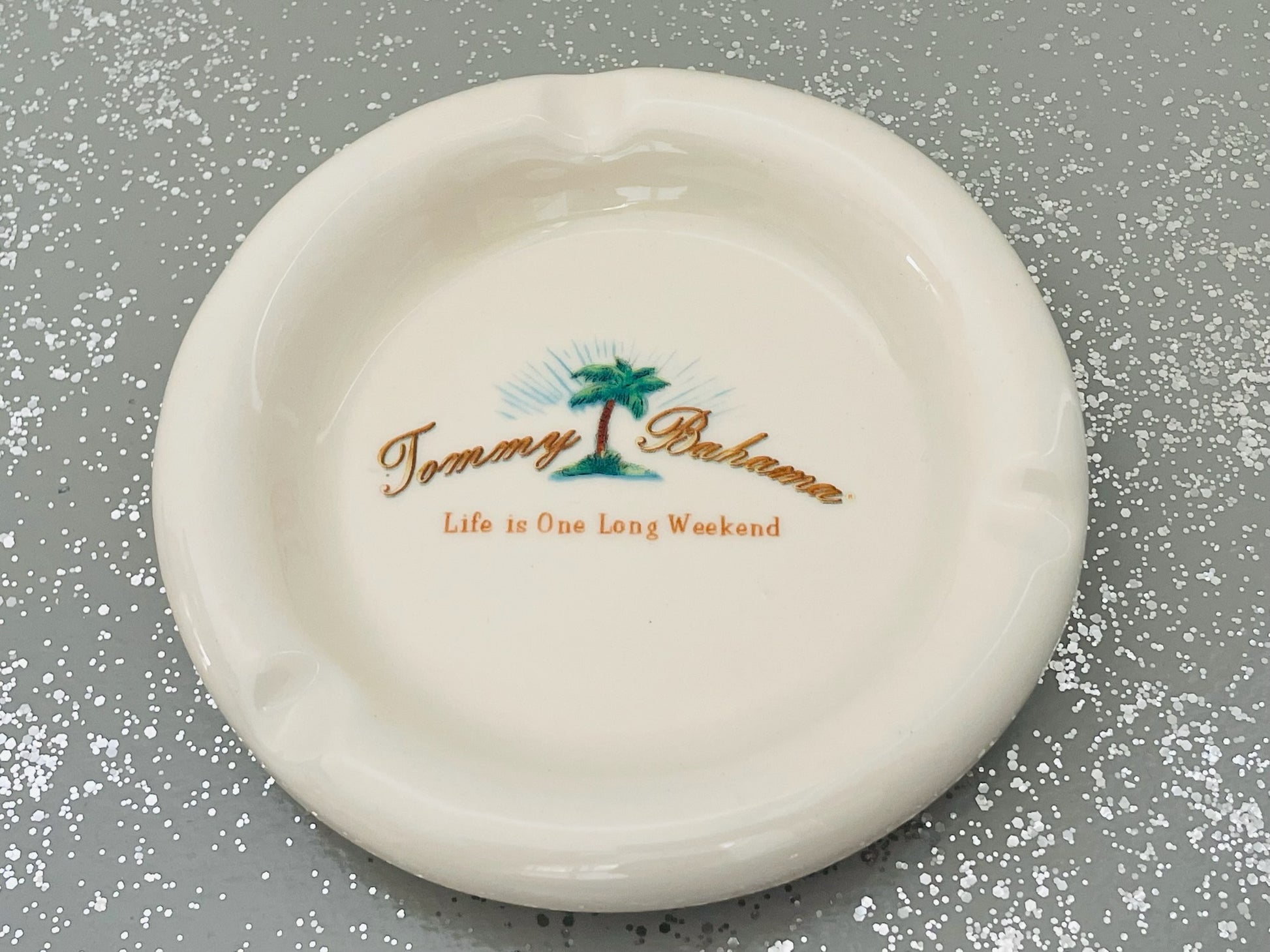 A super attractive Tommy Bahama , vintage ashtray with beauty of green palm tree and inspiring message Life is one long weekend. Made in Italy, stamped on the base with logo and symbol. Made of ceramic and quite heavy. Excellent condition with 6" diameter, and 1.5" height from the surface. White, with brown & gold, green and blue on center.