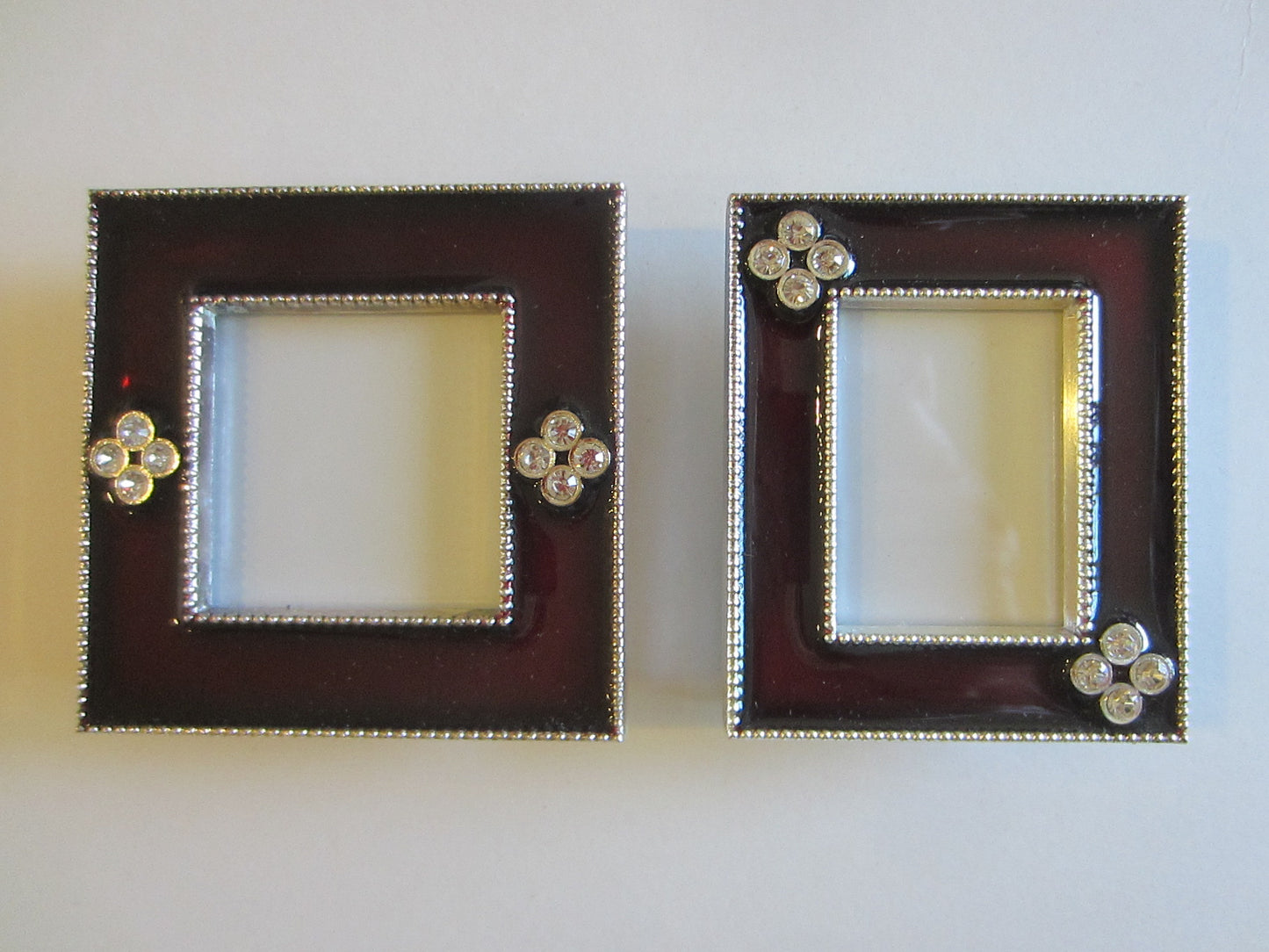 there are two good looking mini silver & burgundy enameling picture frame decorated with eight white rhinestones/crystals in shape of medallion. one vertical, the other square. in superb condition, with self stand, textile verso secured, glass front. you can fit an inch photos and they are just right to be a surprise gifts. bridal shower surprises for his/her photos. 3" x 1"