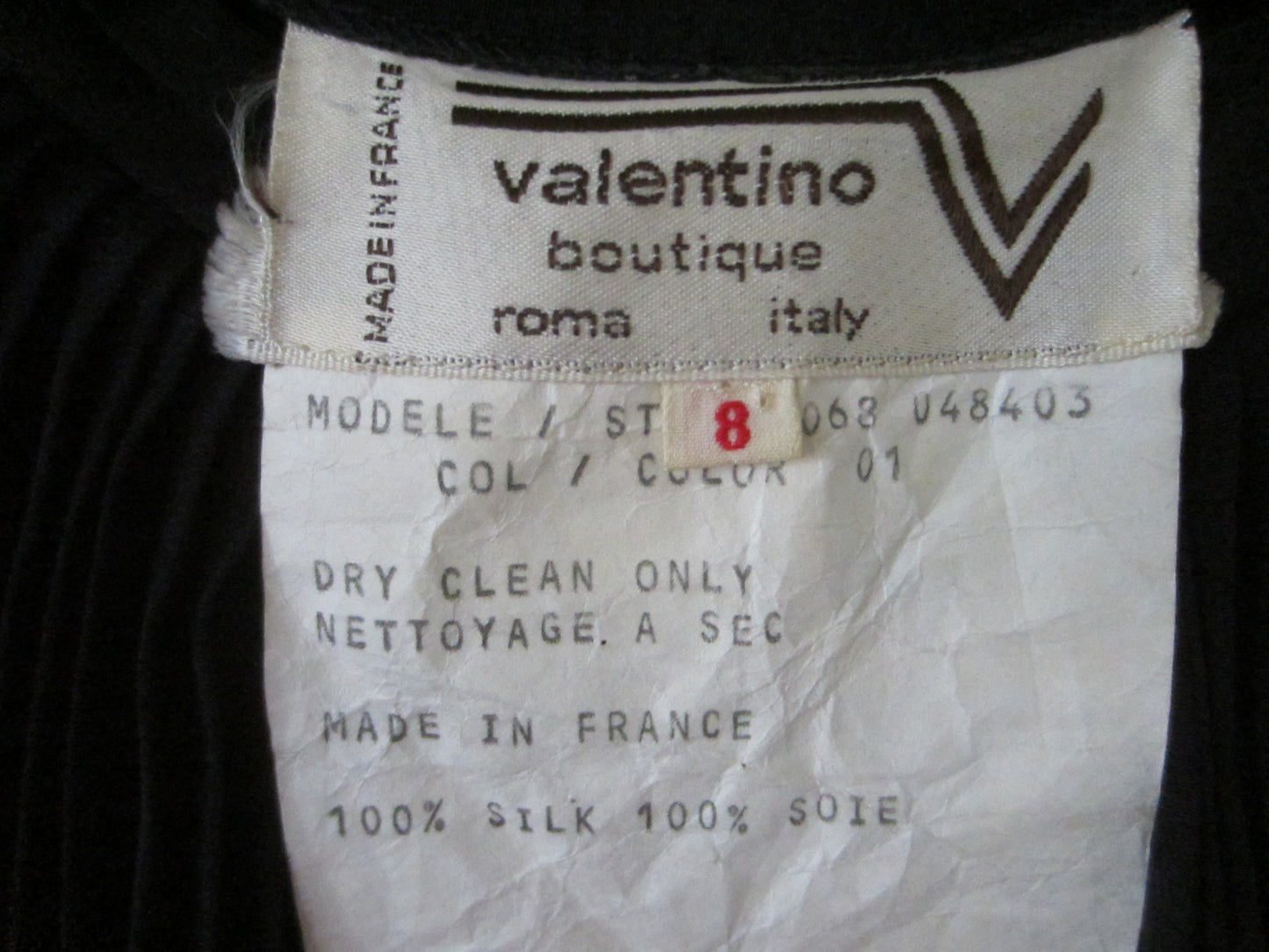 stupendous chic, a black silk skirt with sweet pencils plea, designed in couture studio of Valentino boutique in France, Vintage era, around 80's, and is in fabulous condition. size 8 all marked. side slit, about 33" long, small waist, about 22" circumference, not expandable. all authentic, worn only few times.