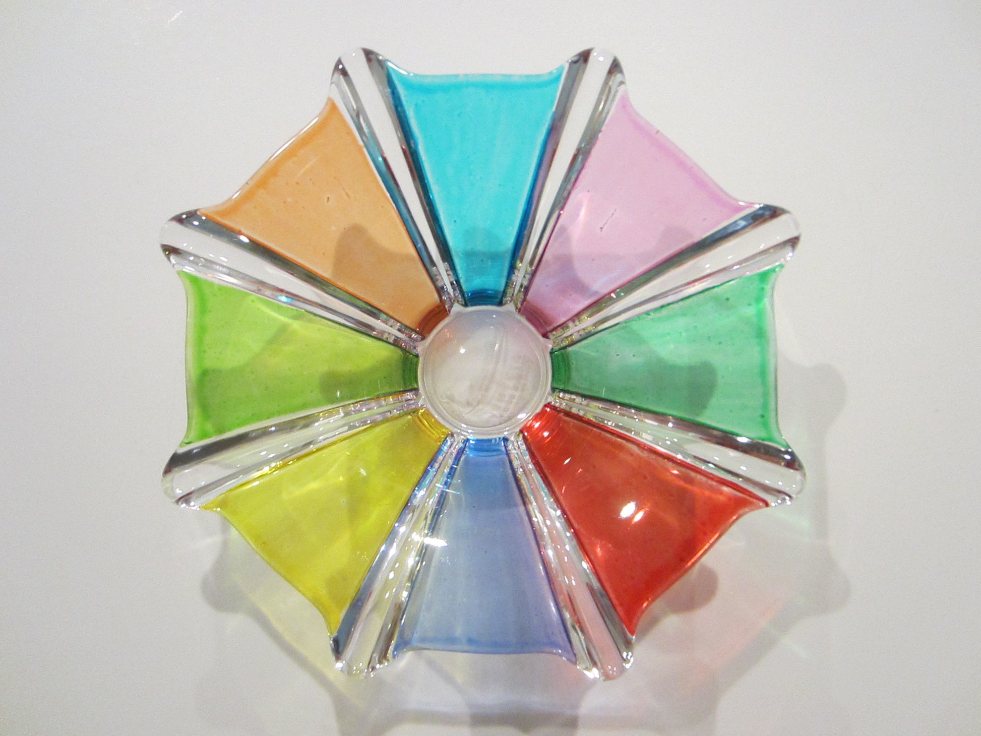 Venezia is marked on the base, Opens like a handkerchief, with logo of ship (gondola ride) . made in Italy, all noted. This gorgeous colorful mini bowl is crafted in Venice, the land of beautiful glass, and glass makers. The colors of yellow, blue, orange, lavender, red, and green with clear accents in between, are spectacular... excellent condition. Any table will shine in glam.