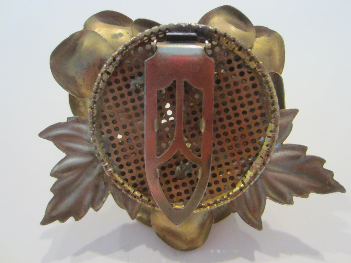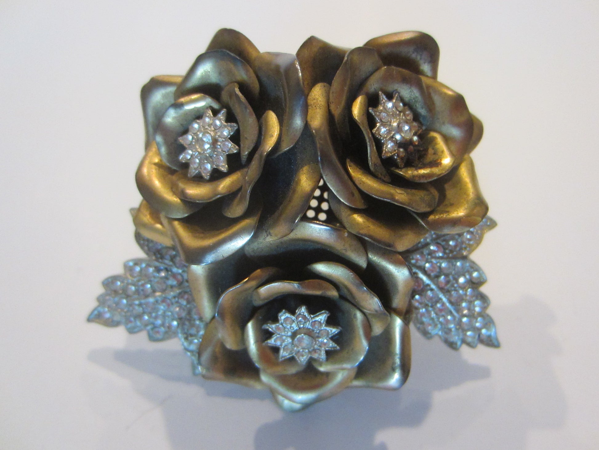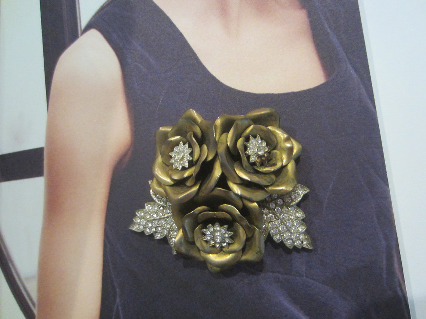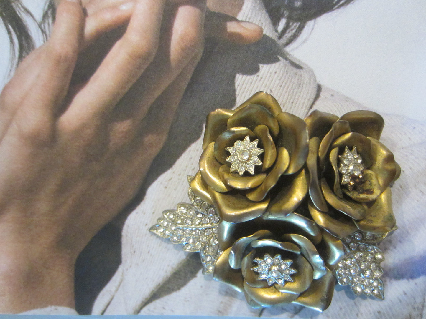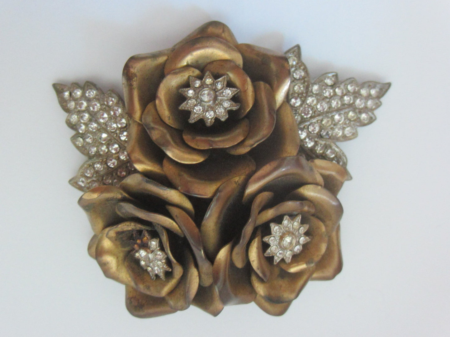 Mid Century Brass Roses Dress Clip Embellished Rhinestones
