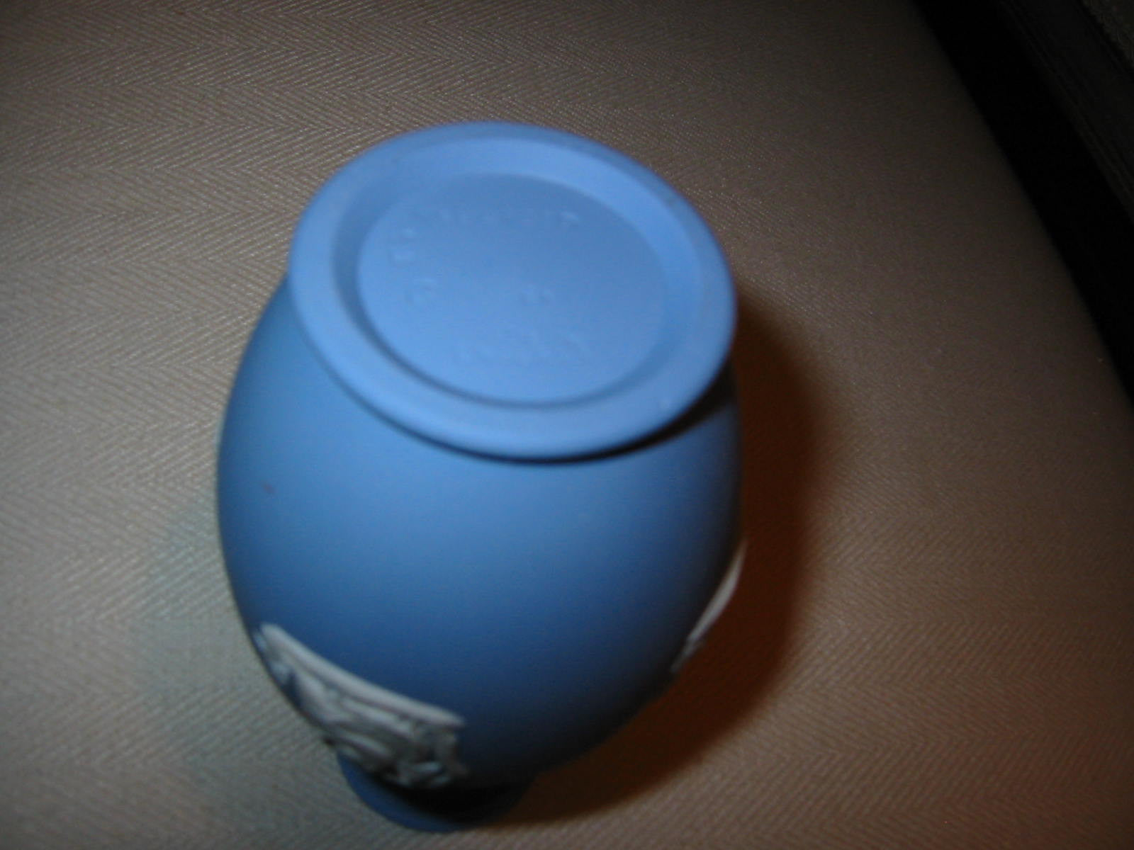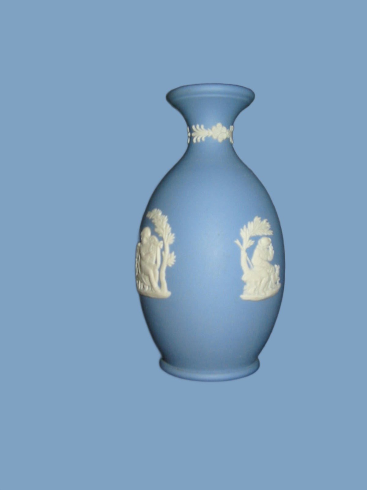 beautiful small vase features Wedgwood Jasper with white medallion portrait Bass relief. engraving mark noted Wedgwood - England, and is numbered. Excellent condition. 5 " height, 3" diameter. It's a fabulous decor element, memorabilia collector's finds.