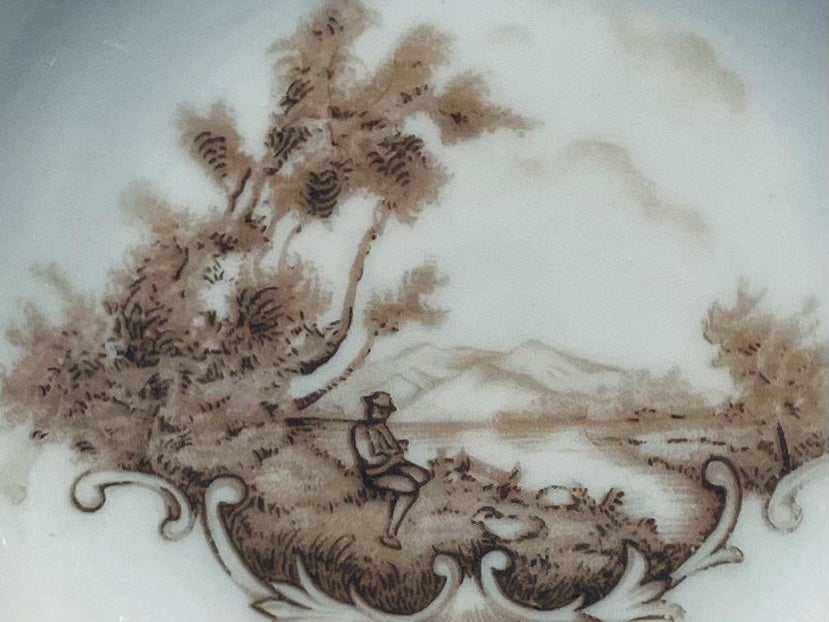 Winterling Bavaria, Beautifully, decorated, most likely painted with gold work. Pair of Ashtrays, made in Germany has stamped , in brown, over white, floral gilding. Different scenery, outdoor, Figurative, excellent, and fun. 4" diam.
